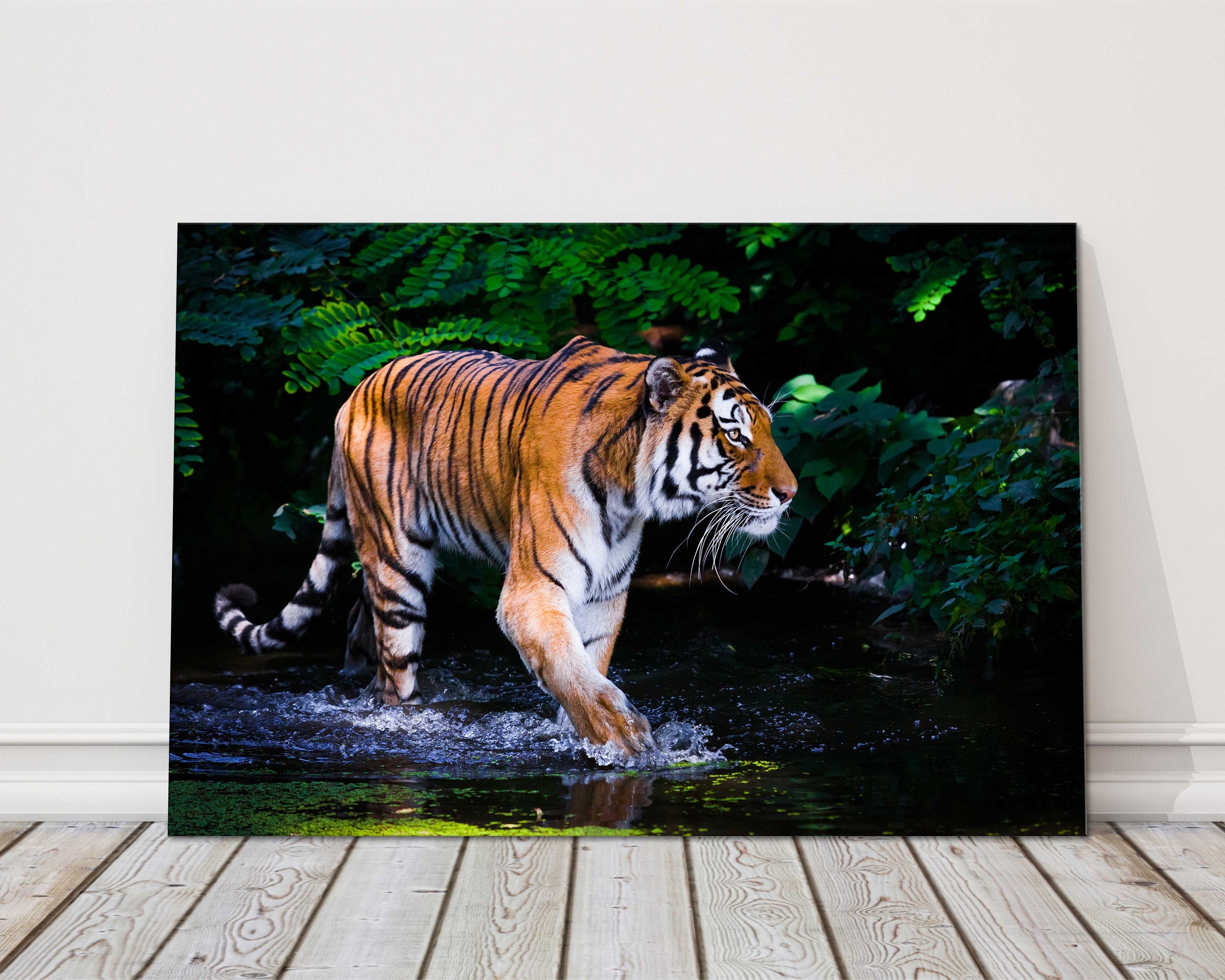 Tiger walking through water in the jungle. Big cats. Beautiful wildlife scene. Pictured on a green background. Printed as a canvas picture print. Choice of sizes available.