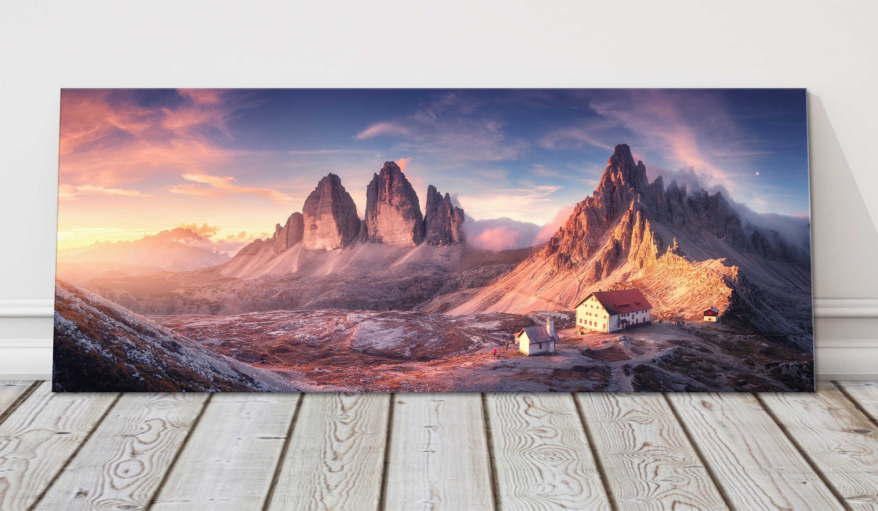 Tre Cime at sunset, Italian Dolomites. Panoramic canvas picture print. Beautiful scenery of the rocky peaks with a single house and church. Picture available to order in a choice of sizes.