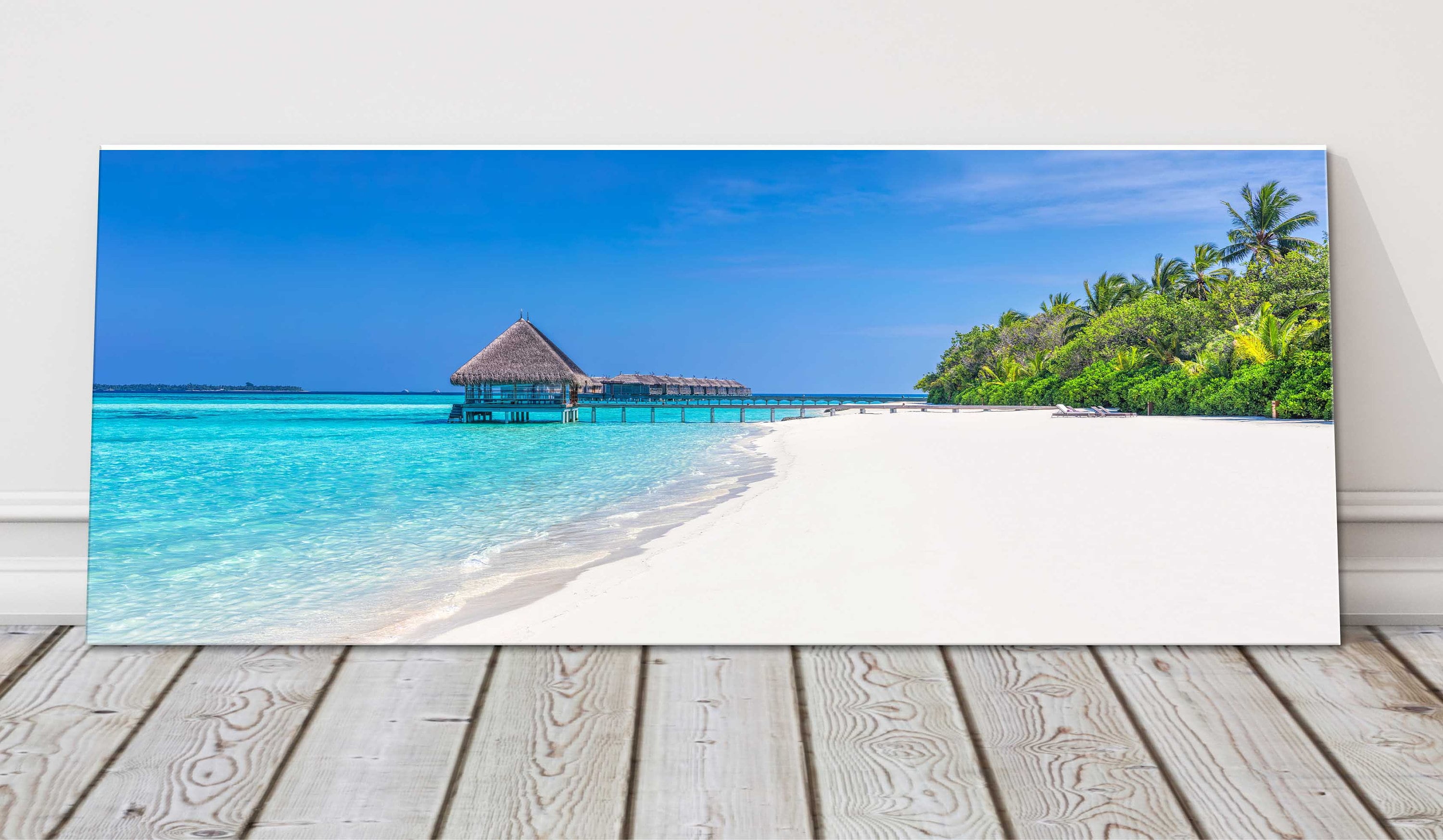 A beautiful panoramic picture of a White sandy beach on a tropical island in the Maldives. Vibrant ocean colours. Seascape. Beautiful calm blue waters. Lovely birthday present/gift.