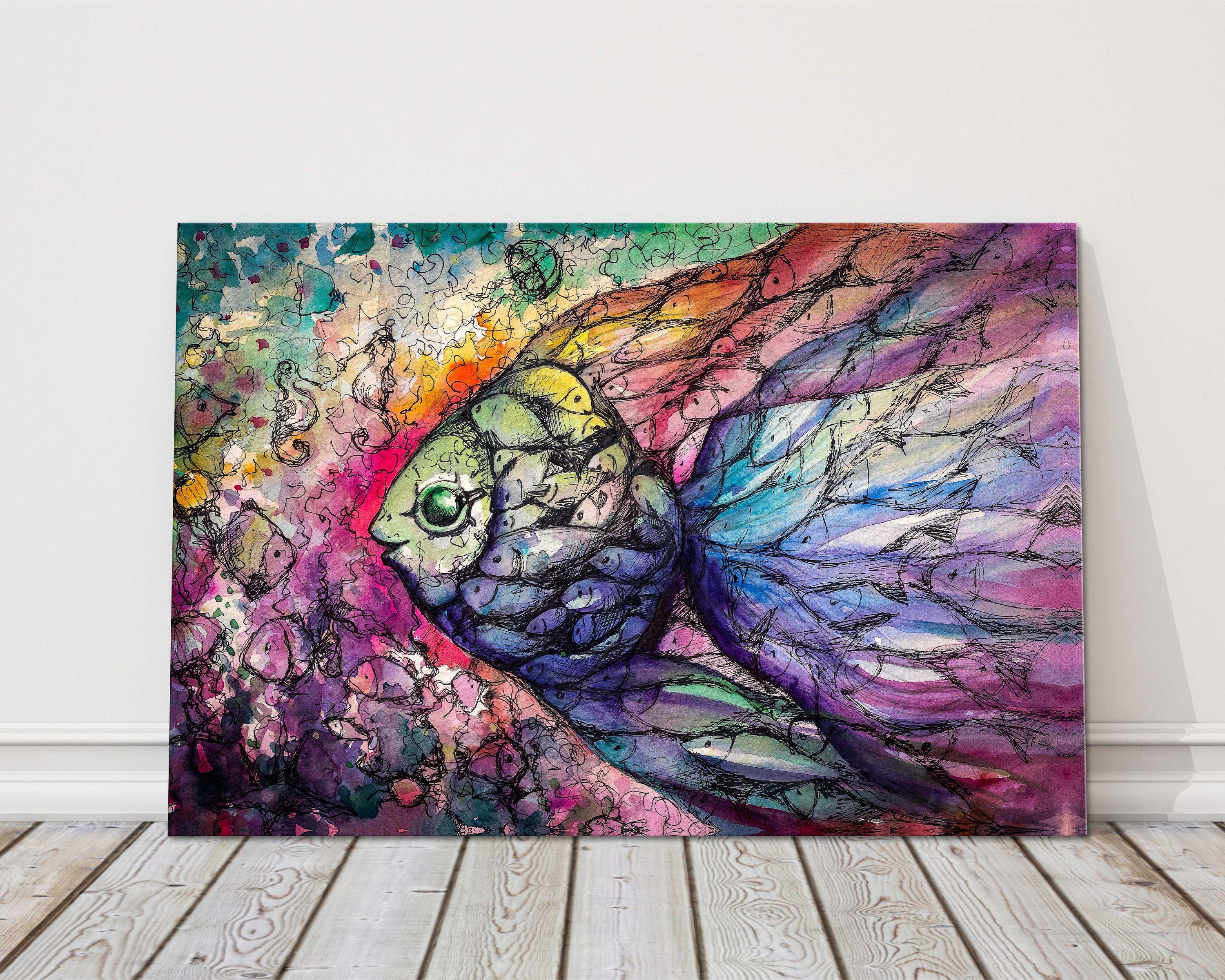 Tropical shoal of fish on the coral reef watercolour canvas picture print.