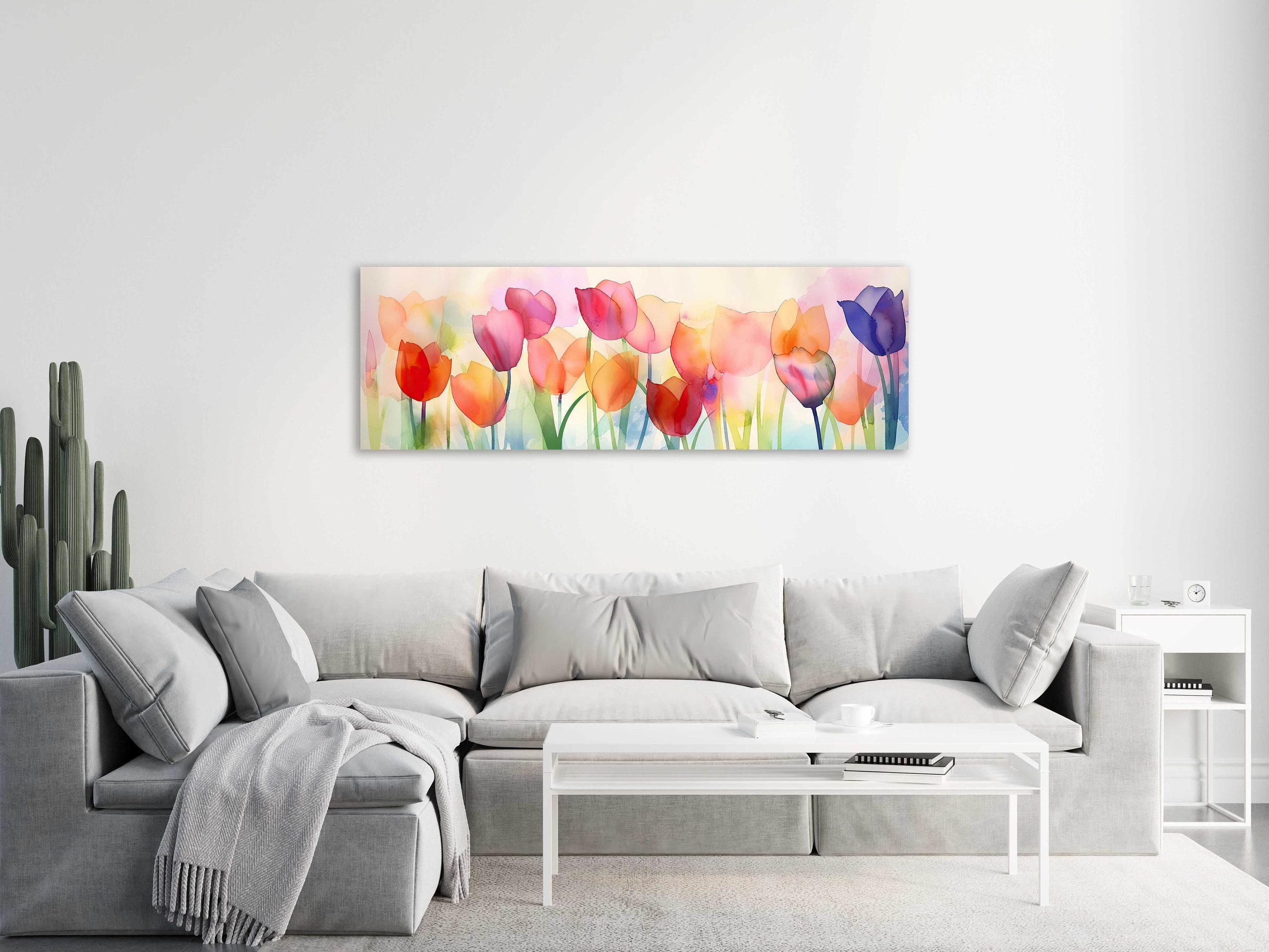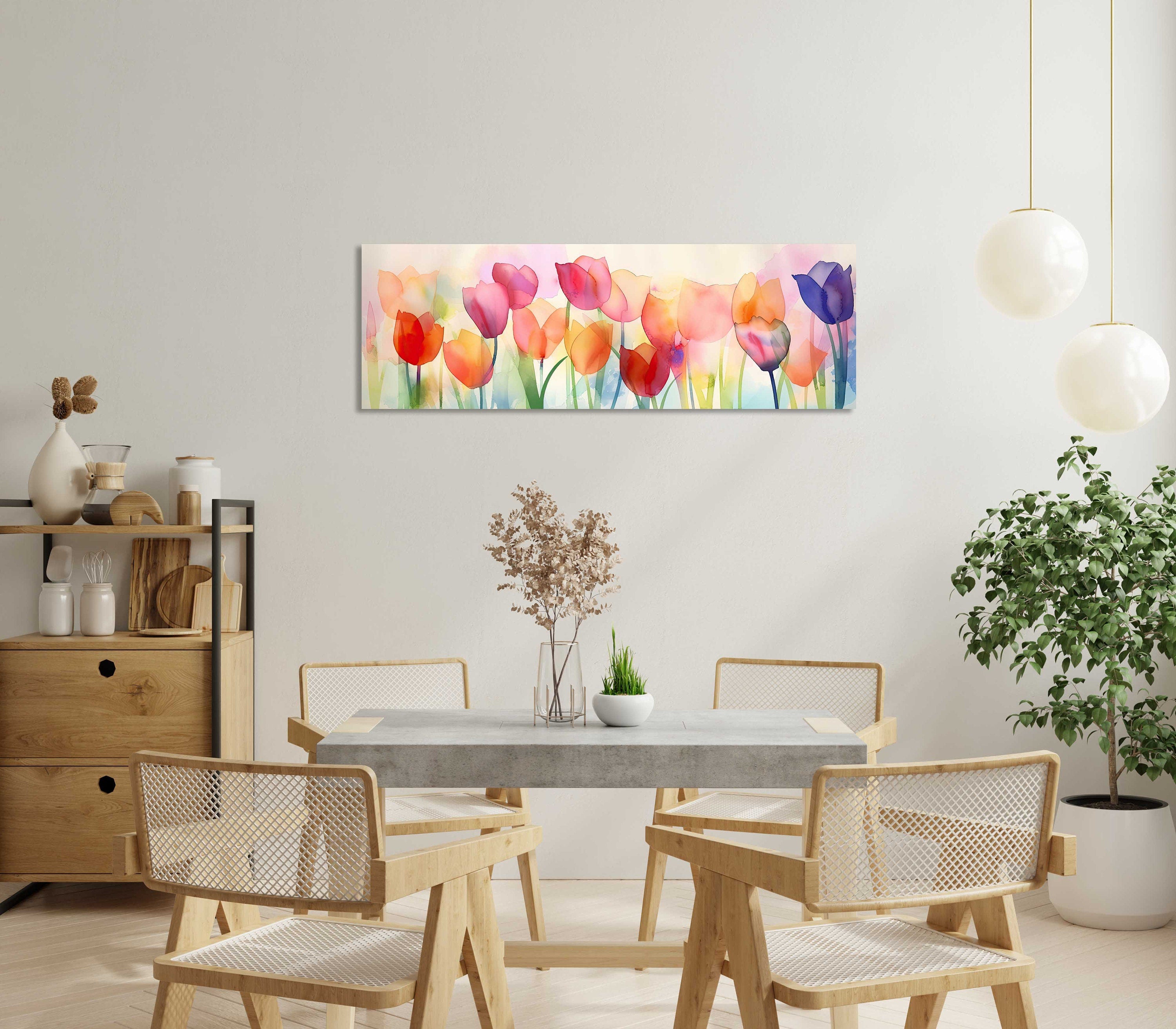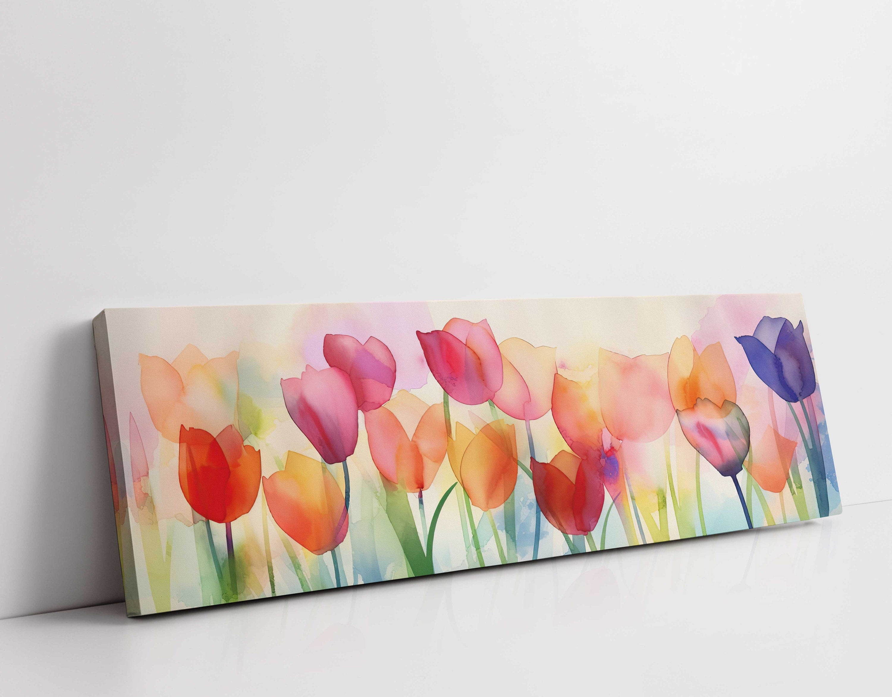 A beautiful panoramic picture of Spring Tulips, watercolour effect. Bright floral wall art available in a choice of sizes.
