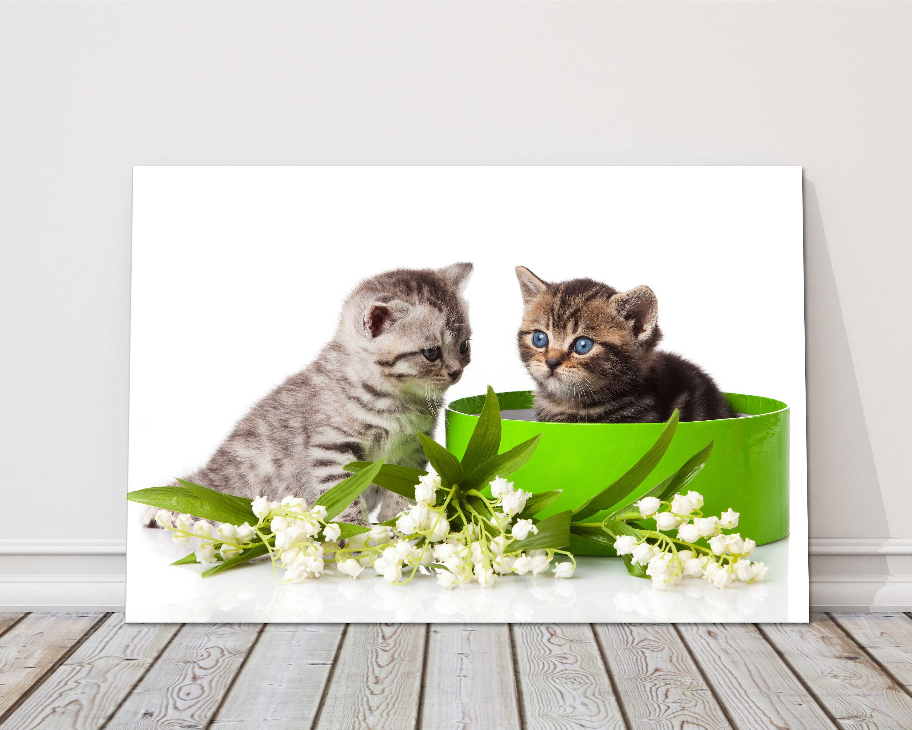 Cute canvas picture of two blue eyed tabby kittens. Playful kittens pictured on a white background. Choice of sizes available to order.