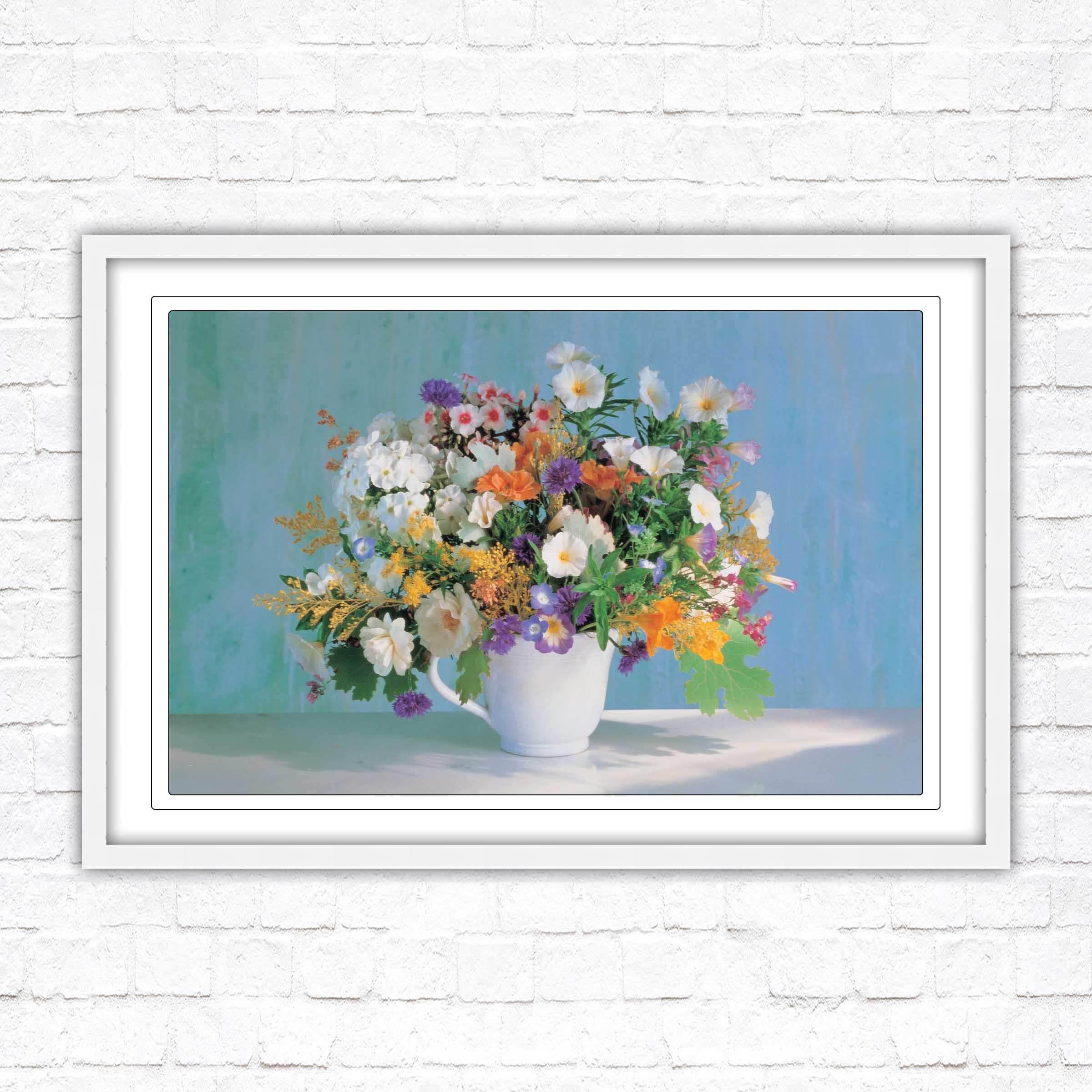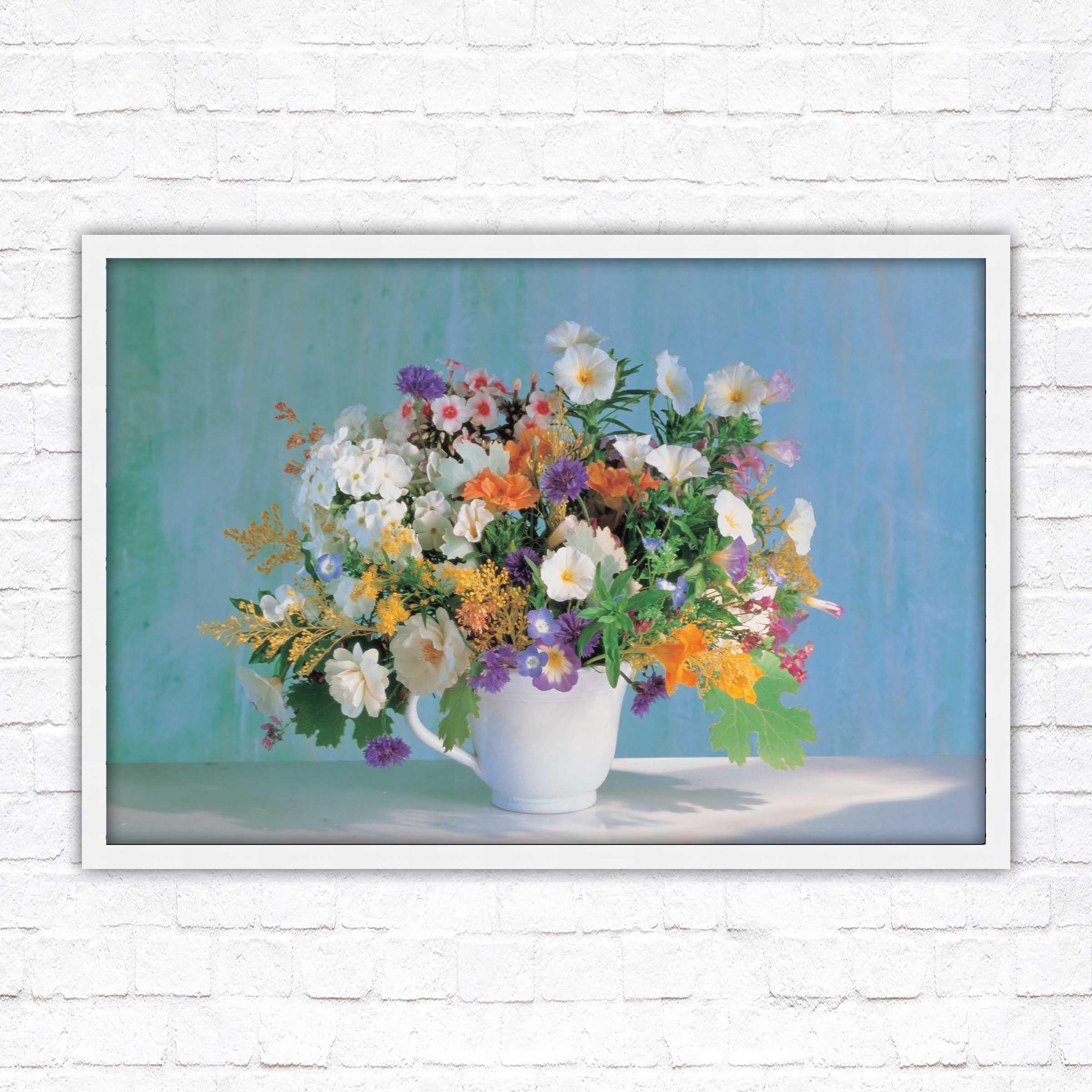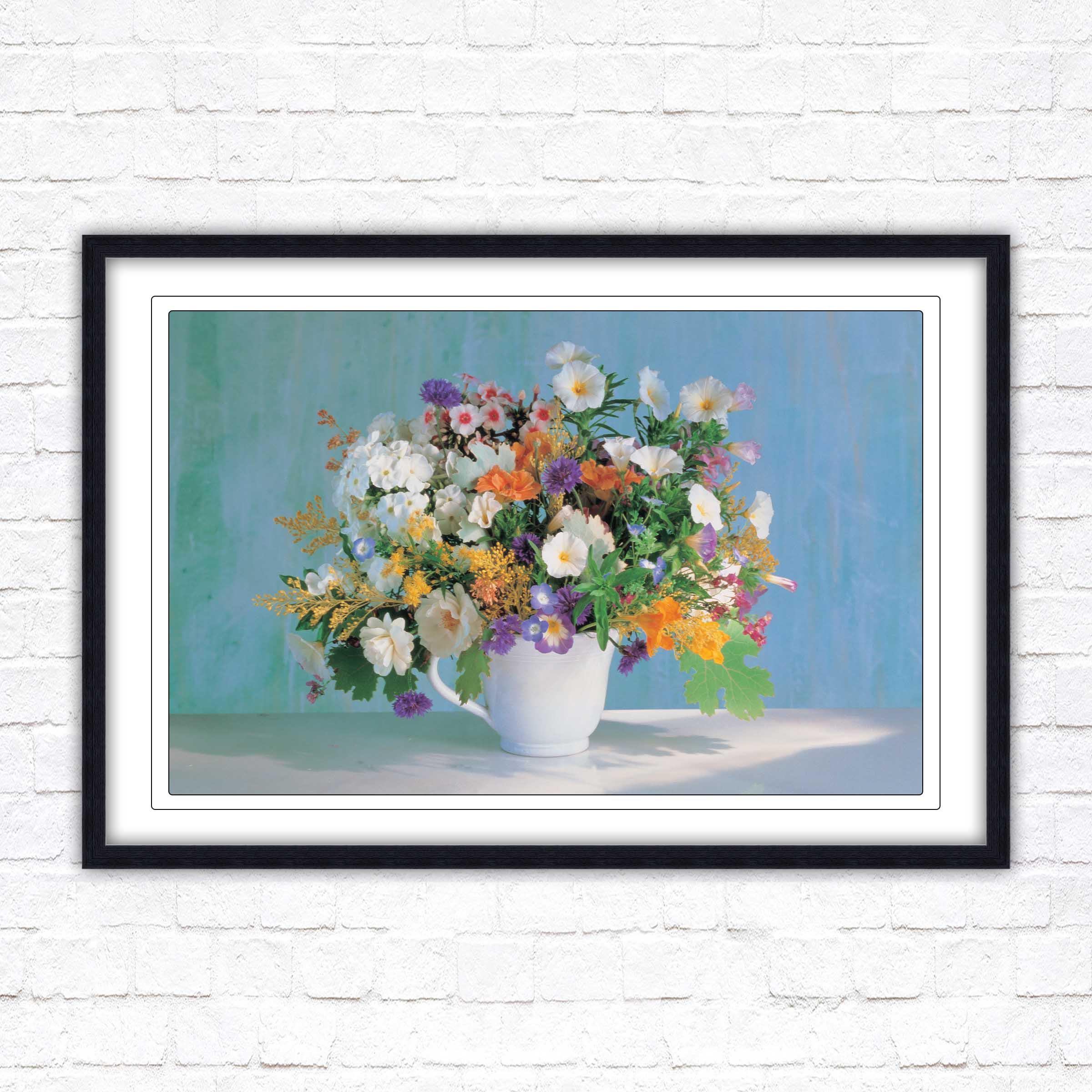 A beautiful framed picture of Beautiful flowers in a white vase. Choose from a selection of frame styles. Lovely Mothers day gift, bright coloured wall art.