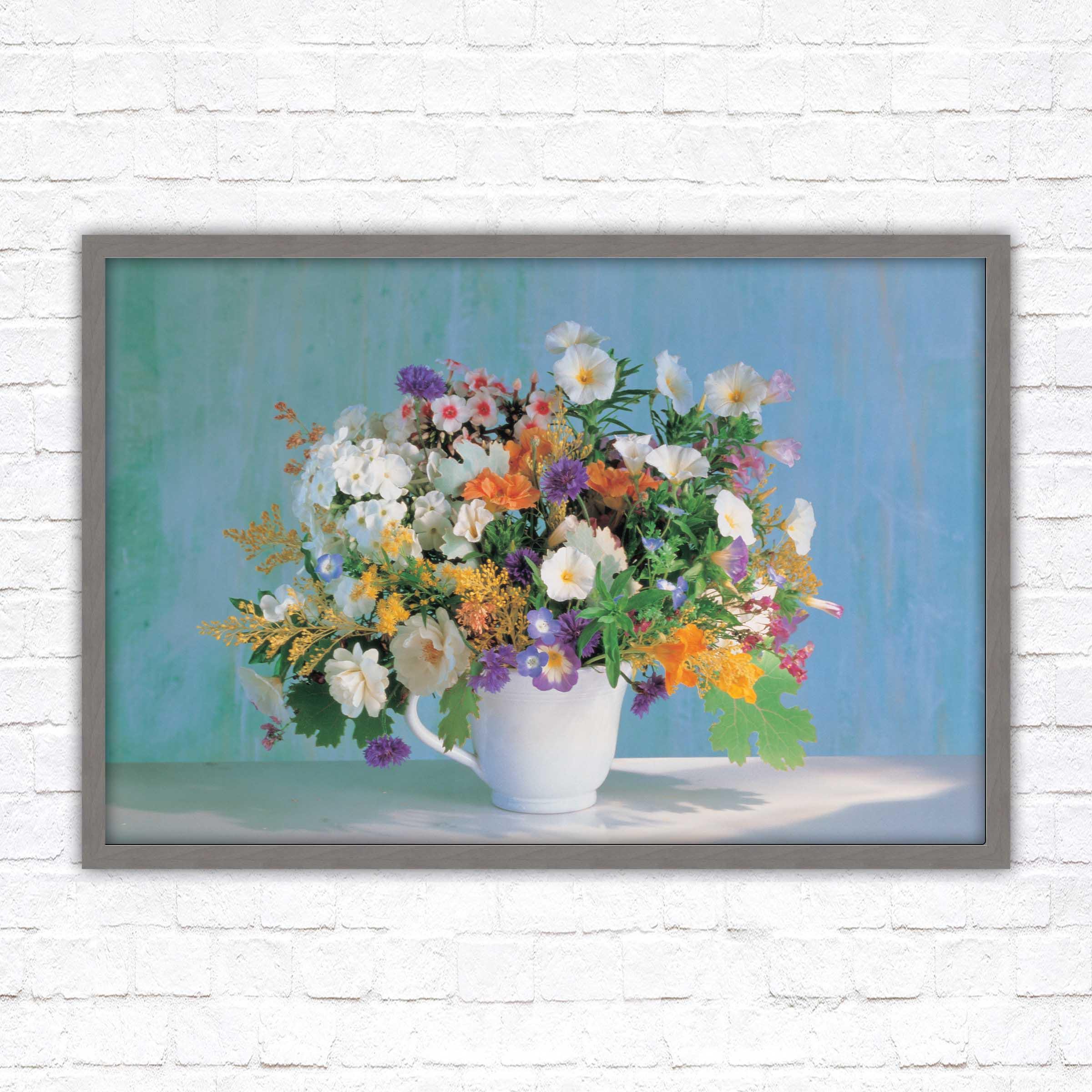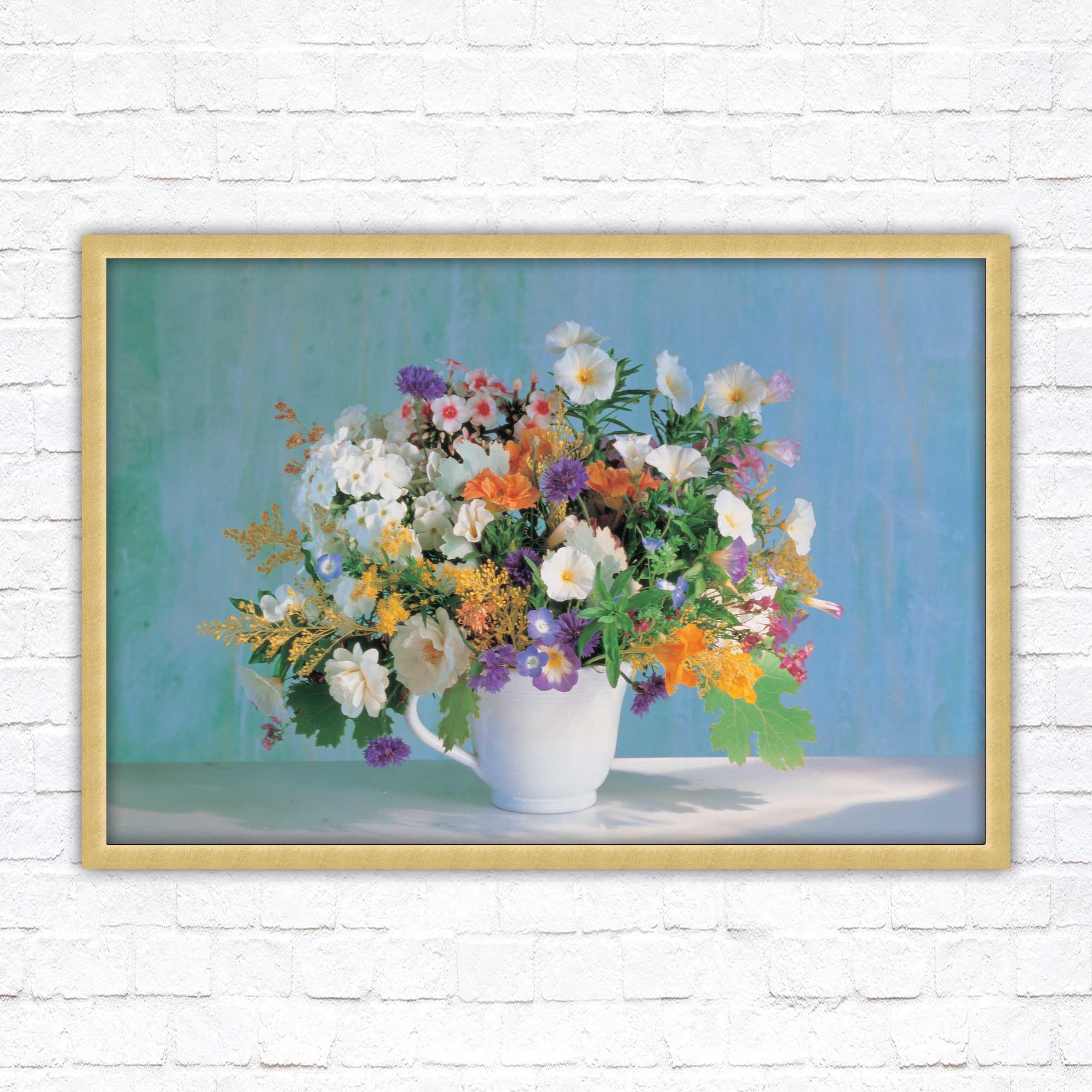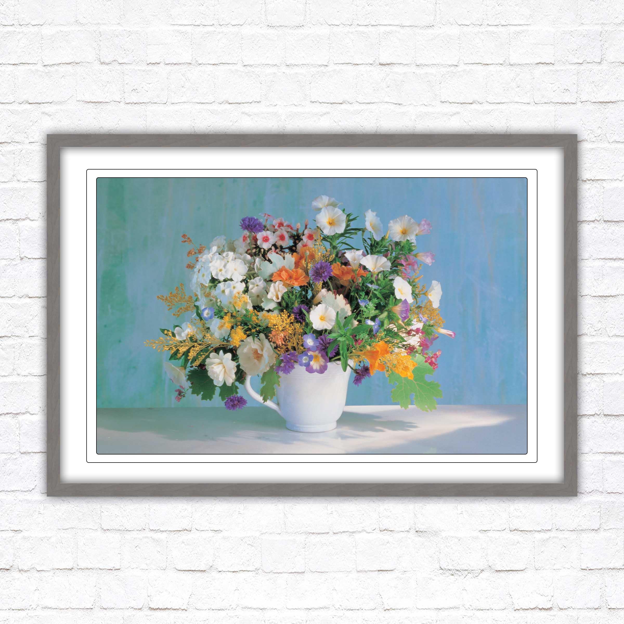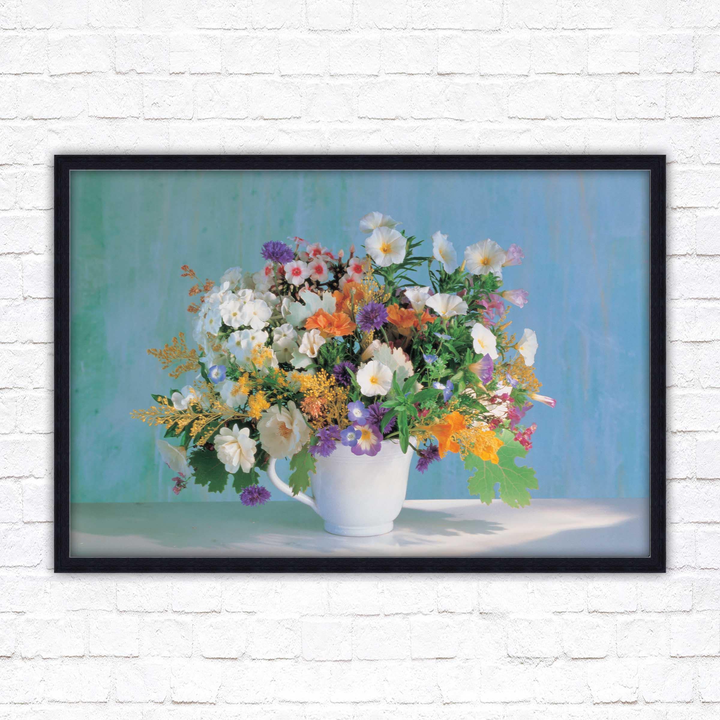 A beautiful framed picture of Beautiful flowers in a white vase. Choose from a selection of frame styles. Lovely Mothers day gift, bright coloured wall art.