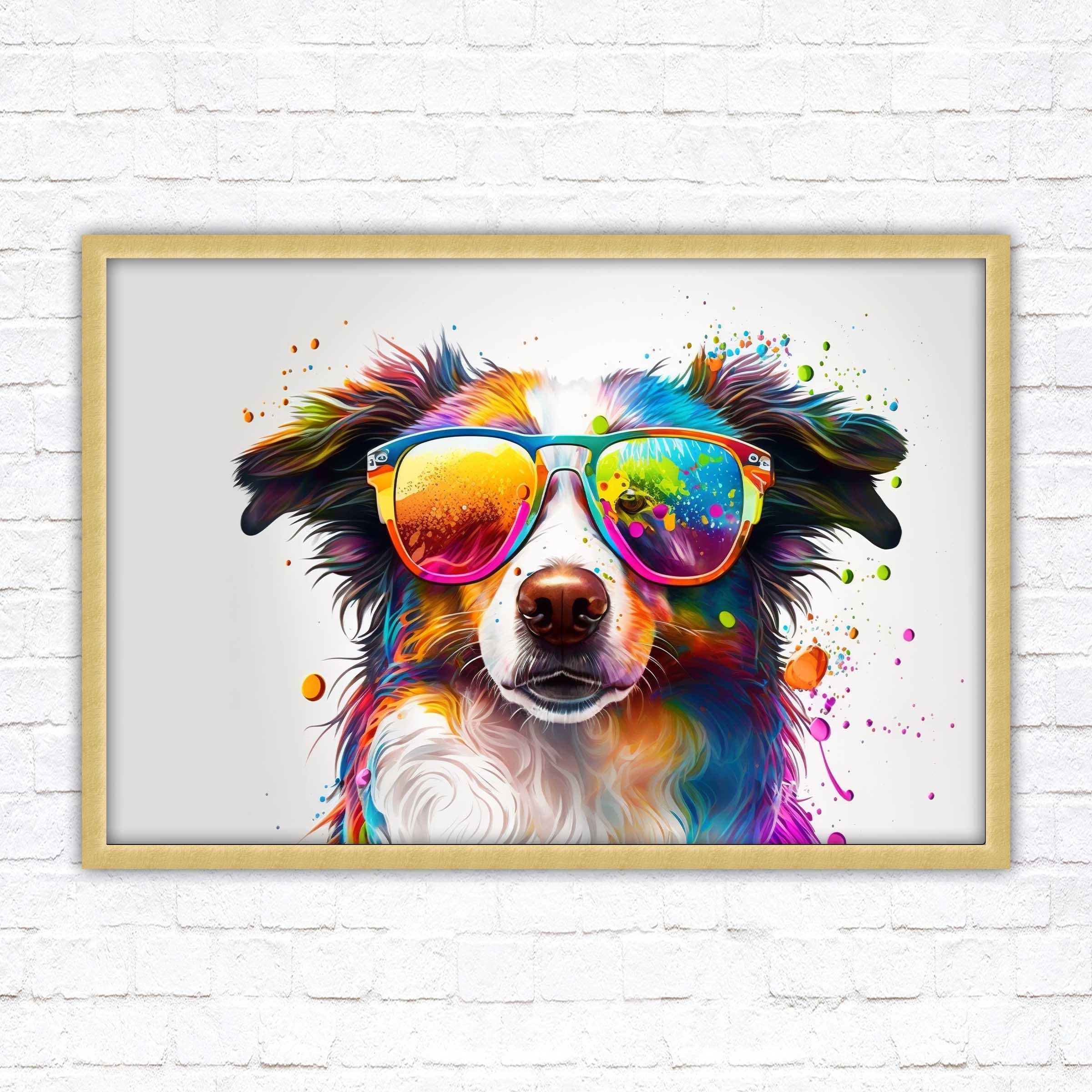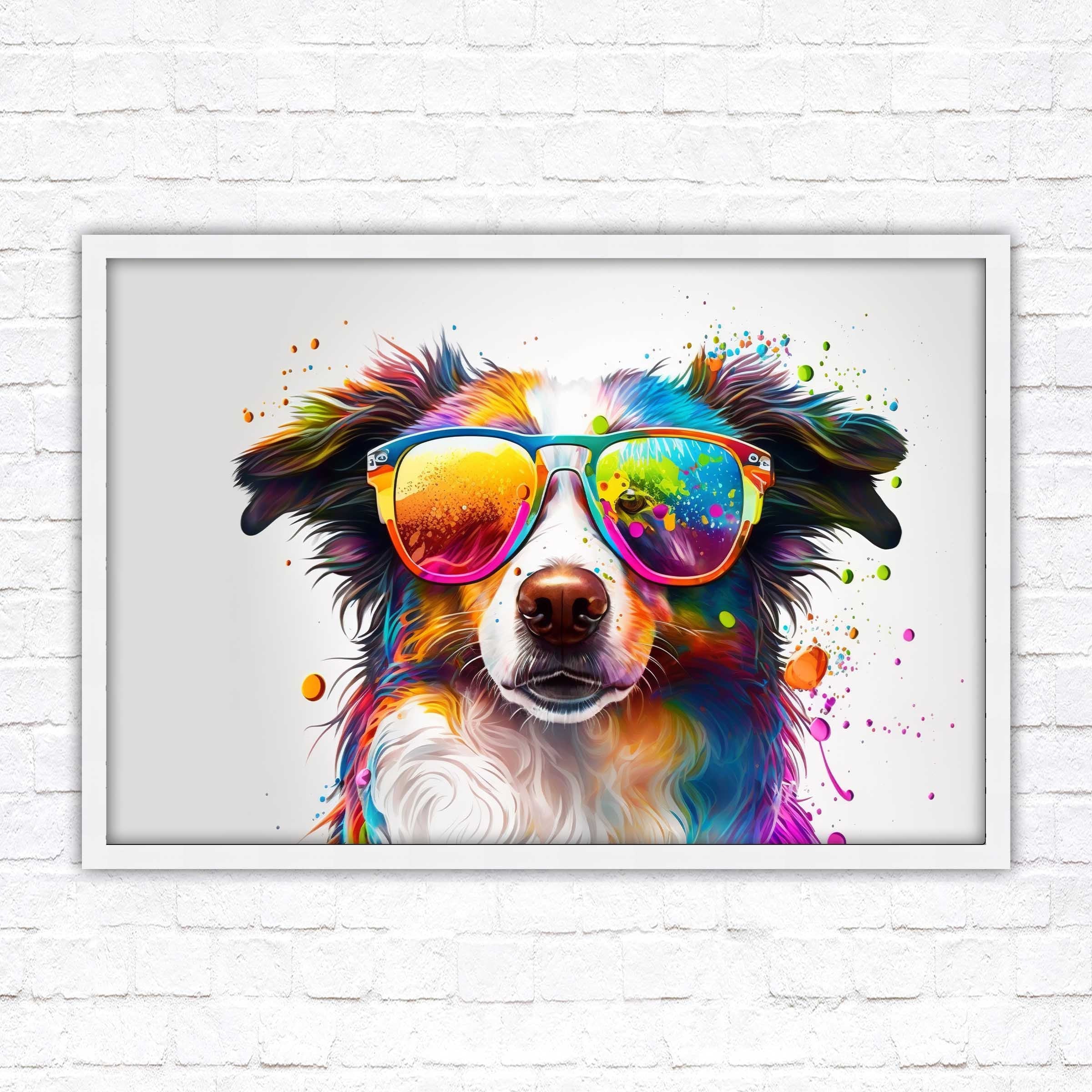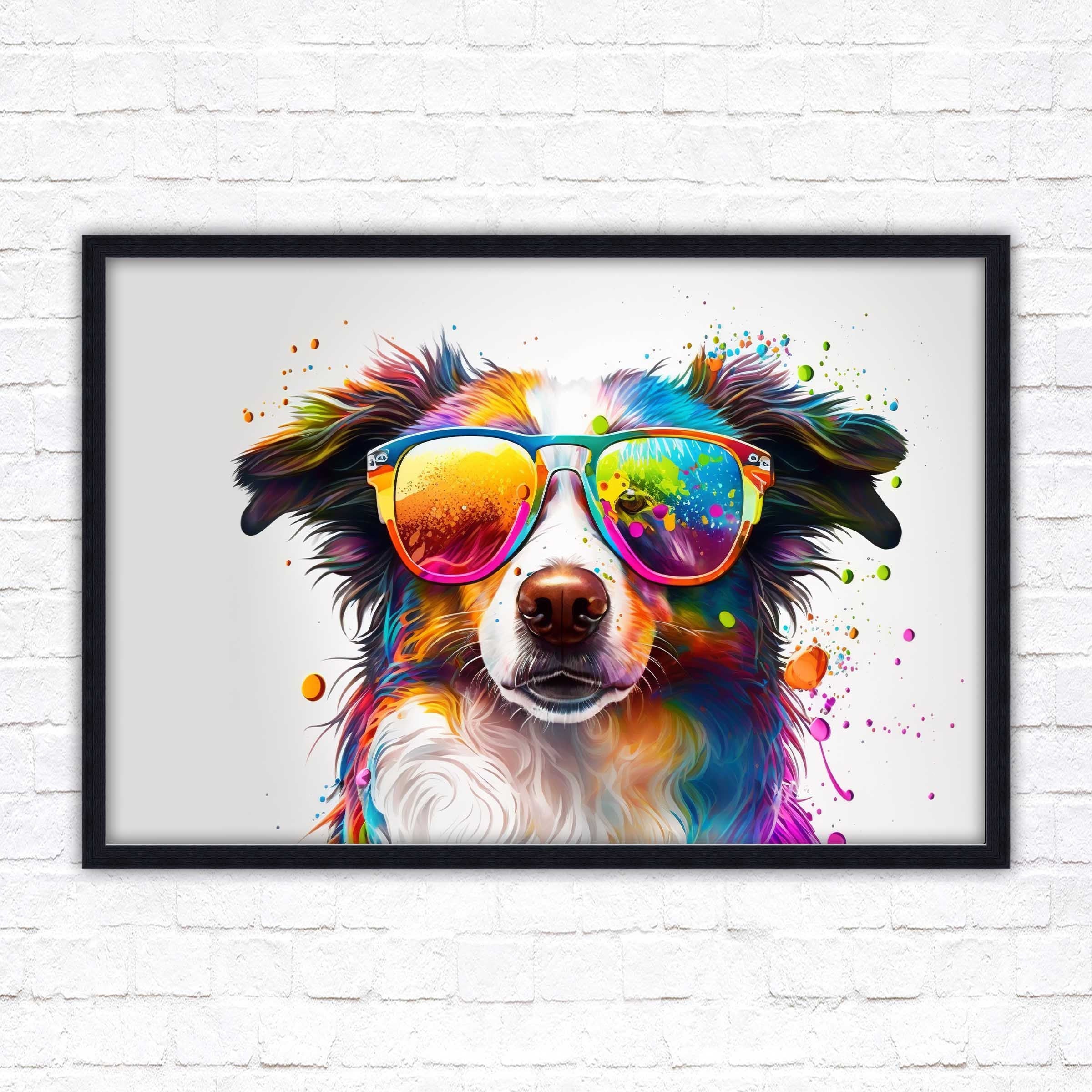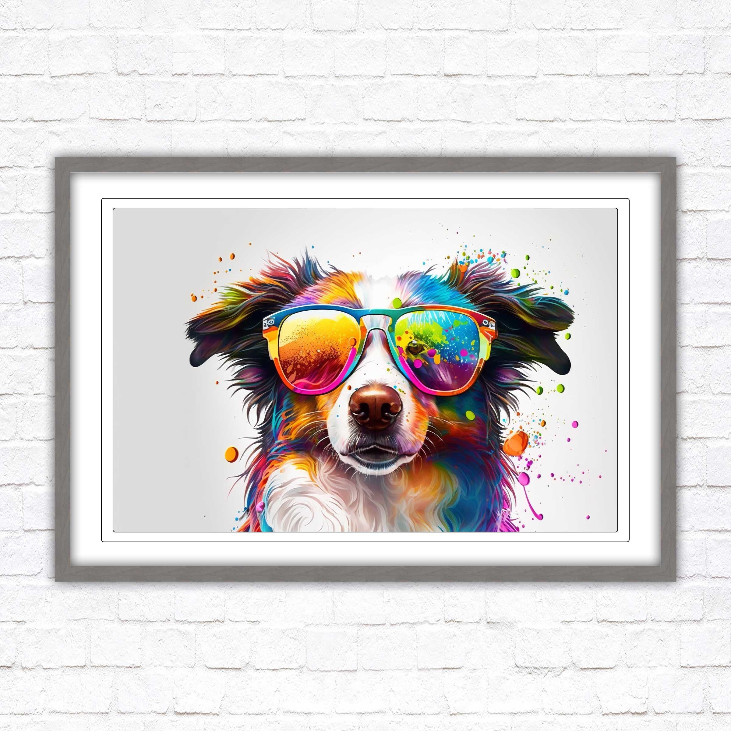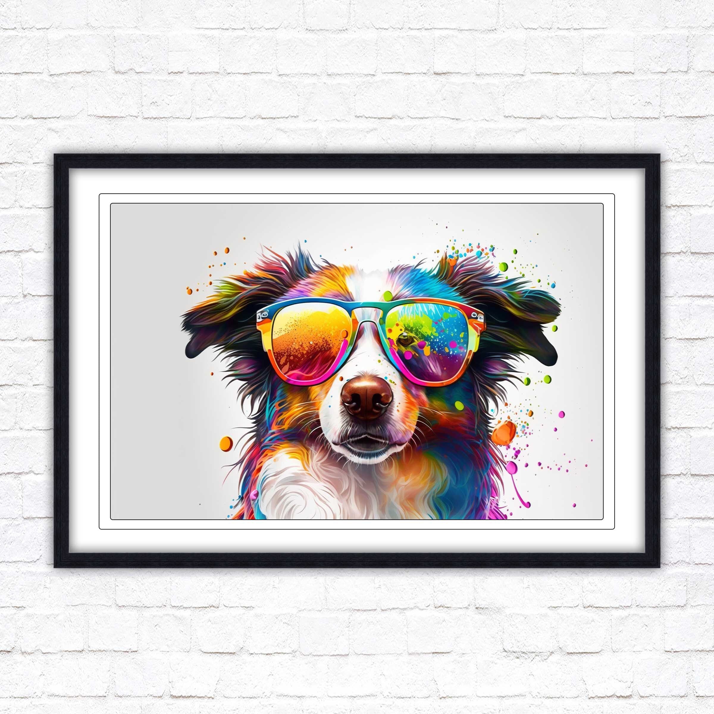 Dog in sunglasses. Bright colourful with paint splash effect. A choice of frame styles and borders.