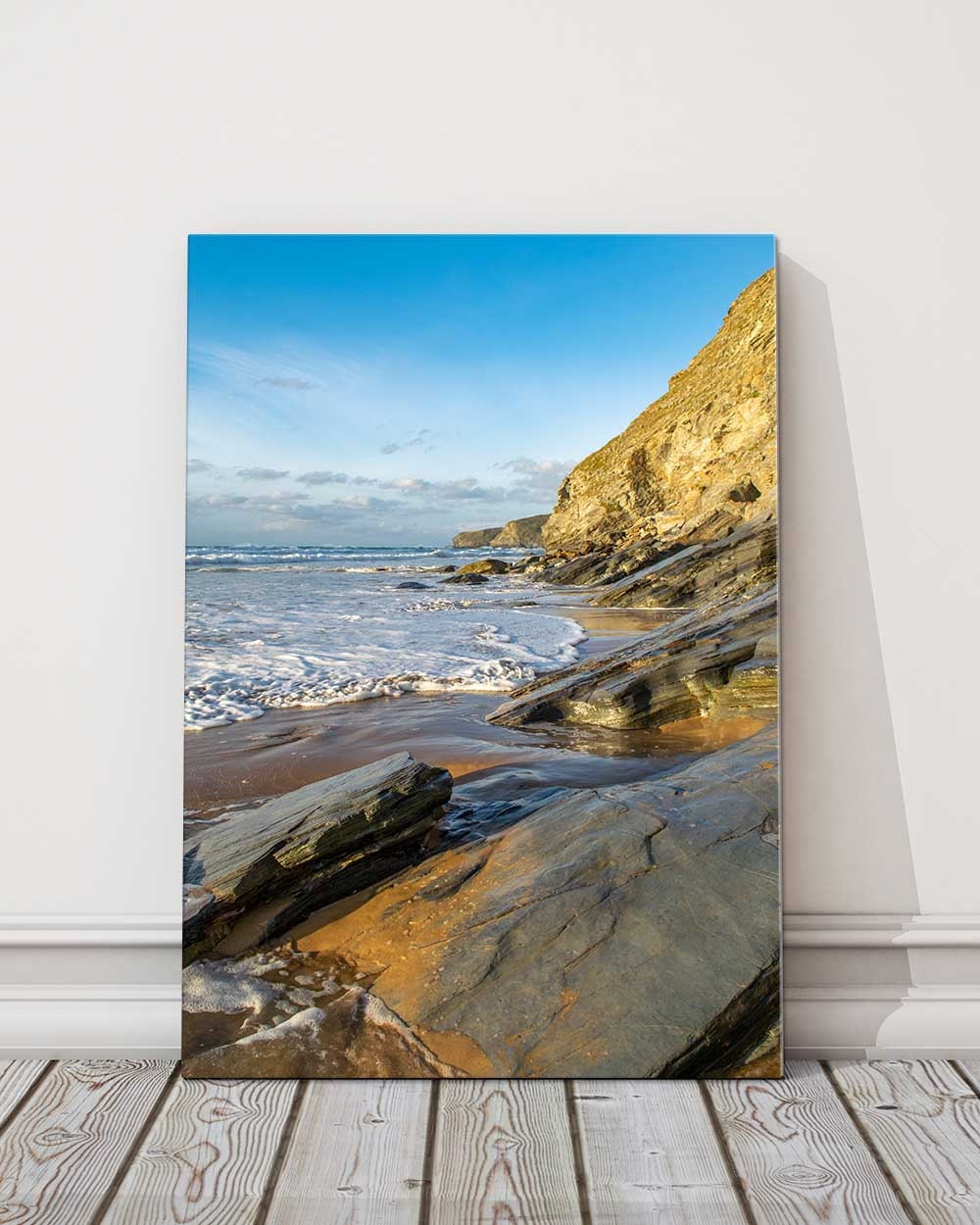 Portrait view Watergate Bay Beach coastline, Cornwall, Printed and framed as a canvas print. Beautiful colours of the sea. Available... Read more