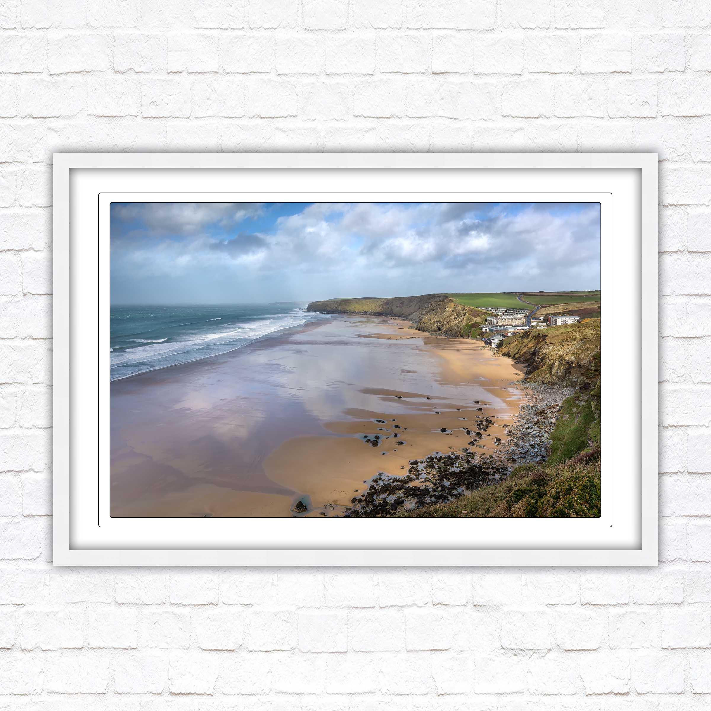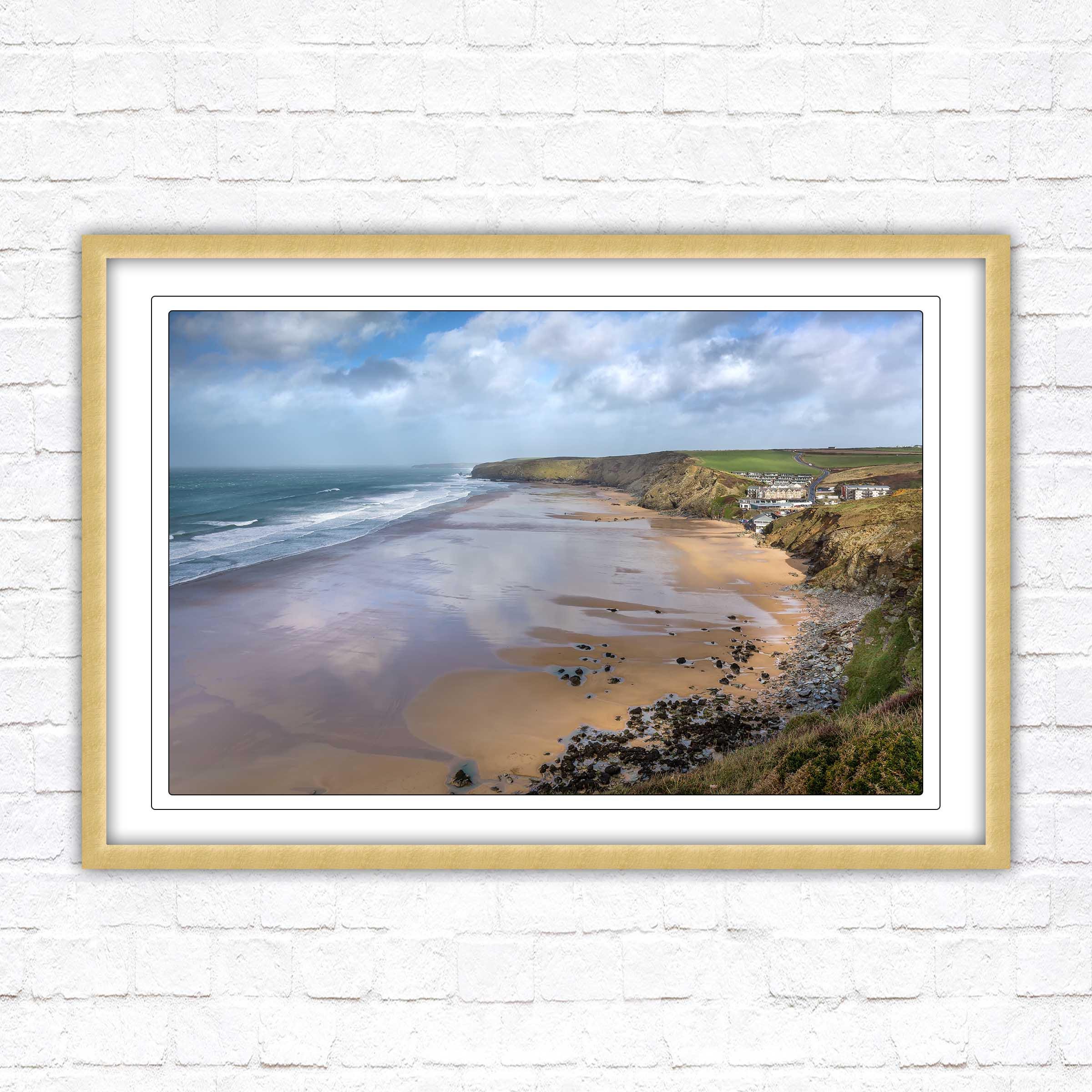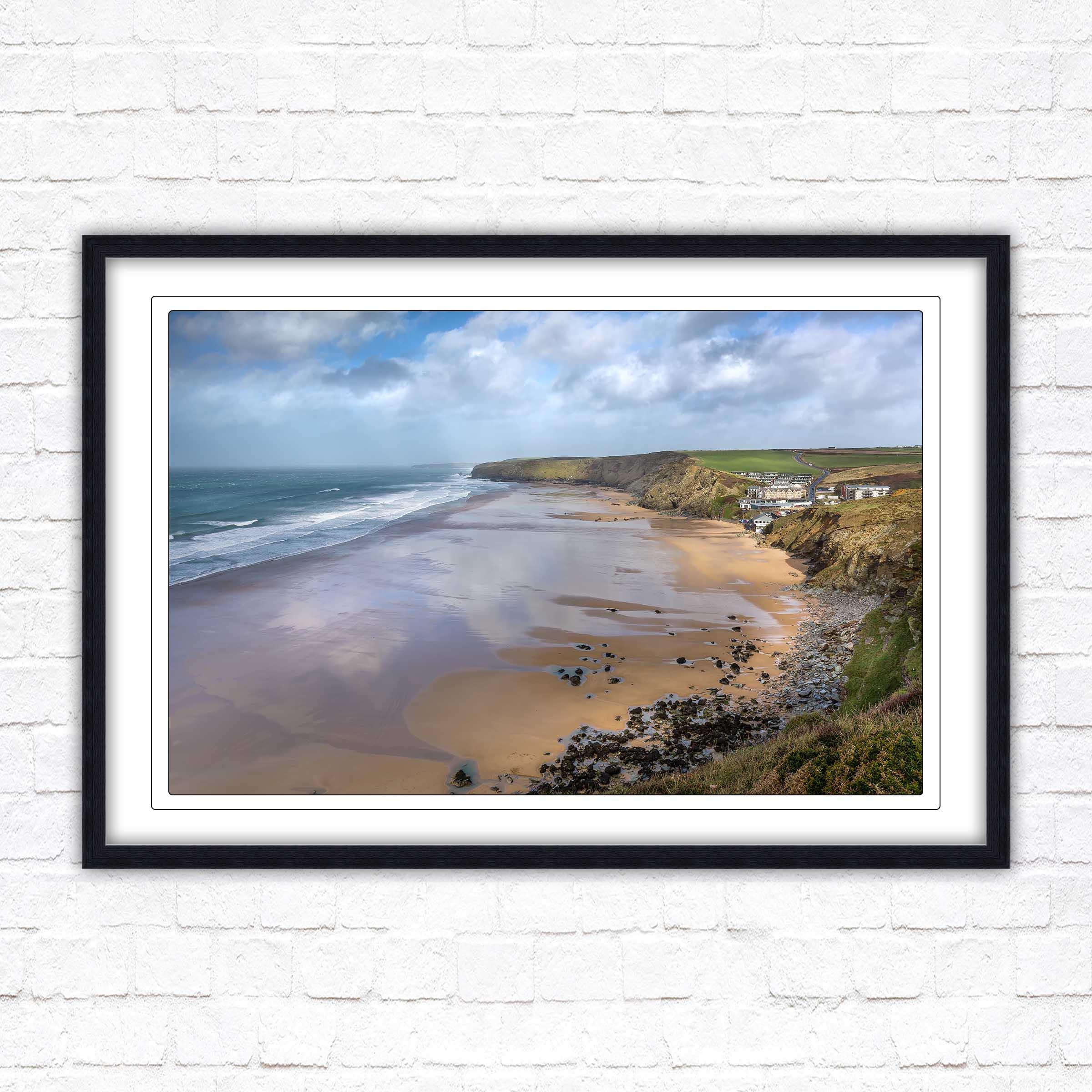 Watergate Bay on a winters day, Cornwall. Framed picture. Choose from a selection of frame styles.