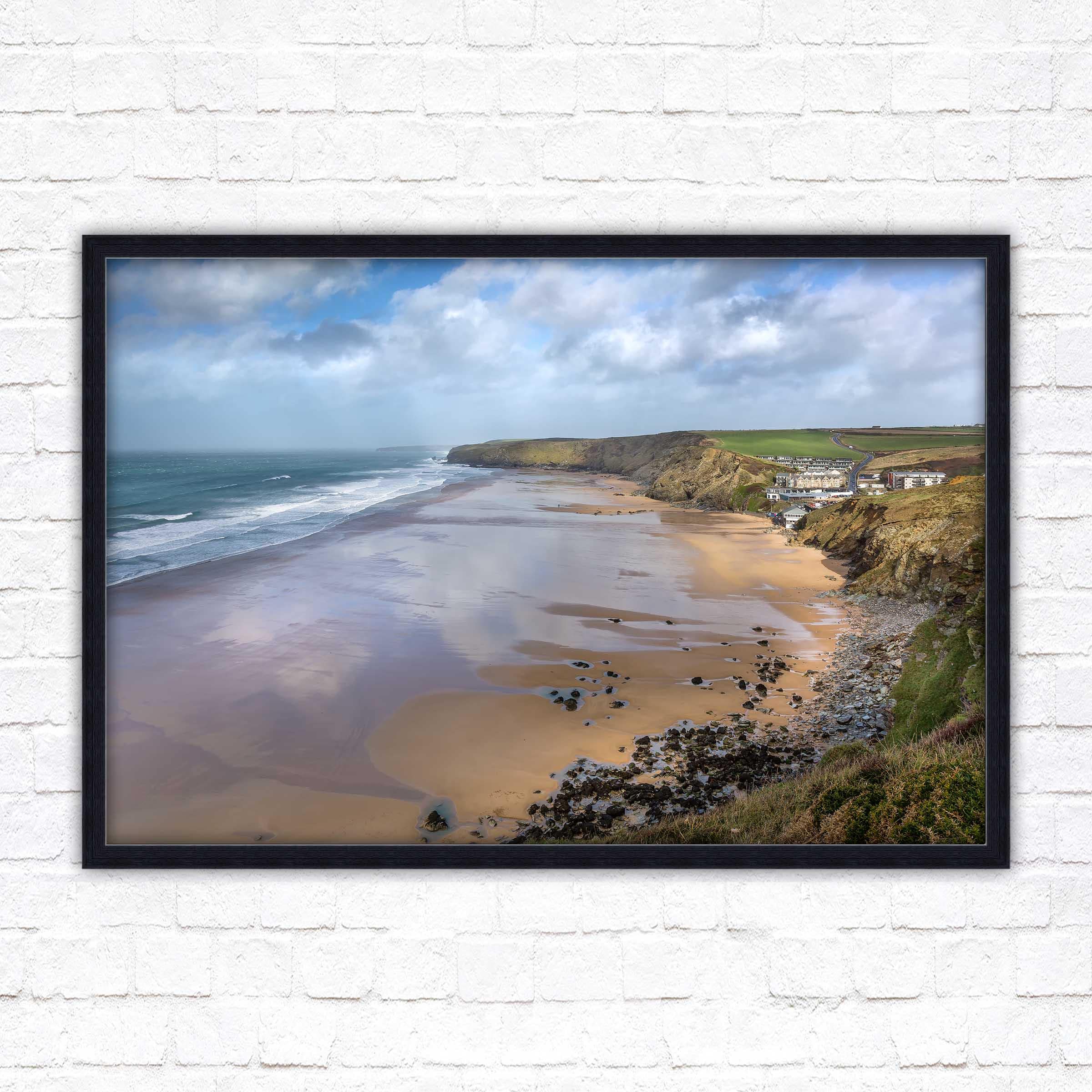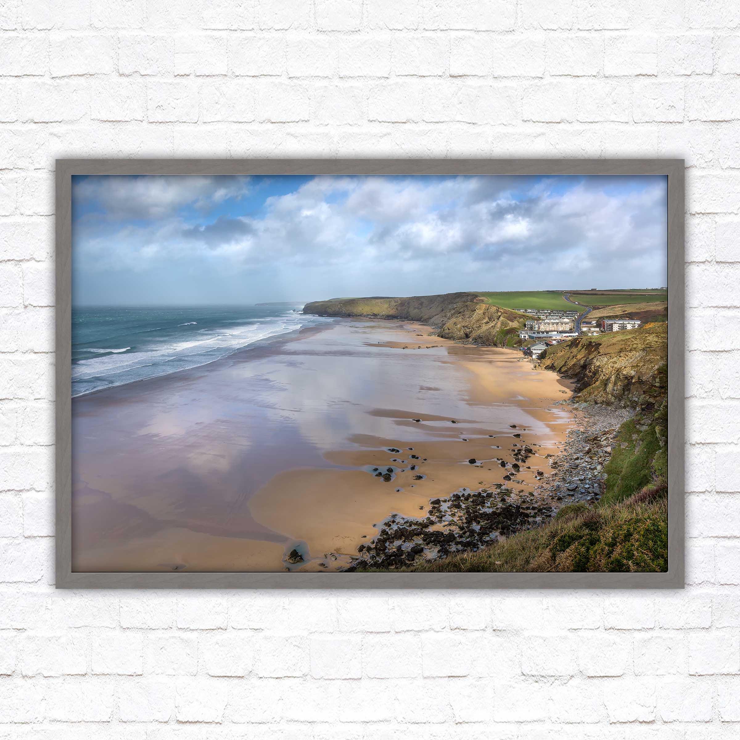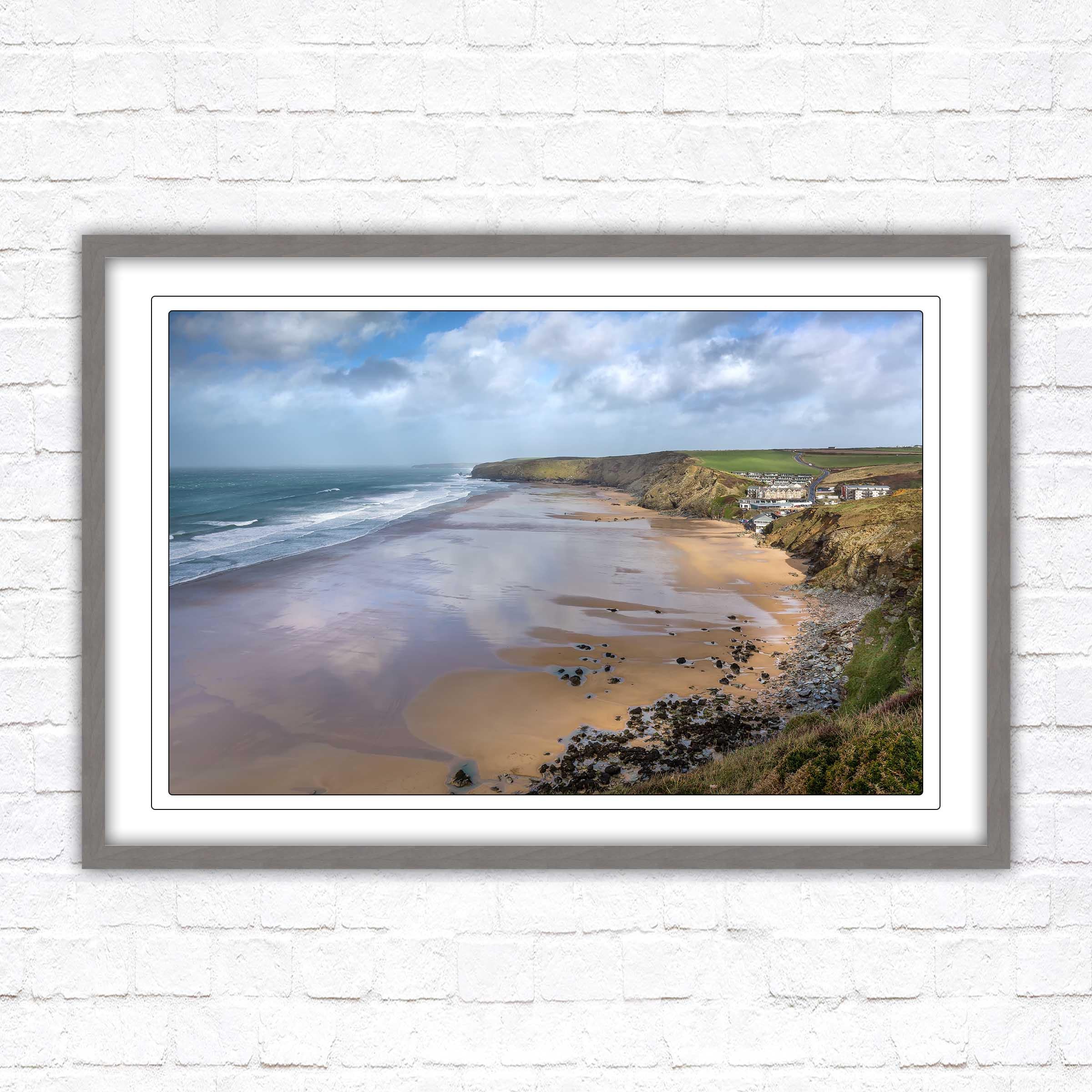 Watergate Bay on a winters day, Cornwall. Framed picture. Choose from a selection of frame styles.