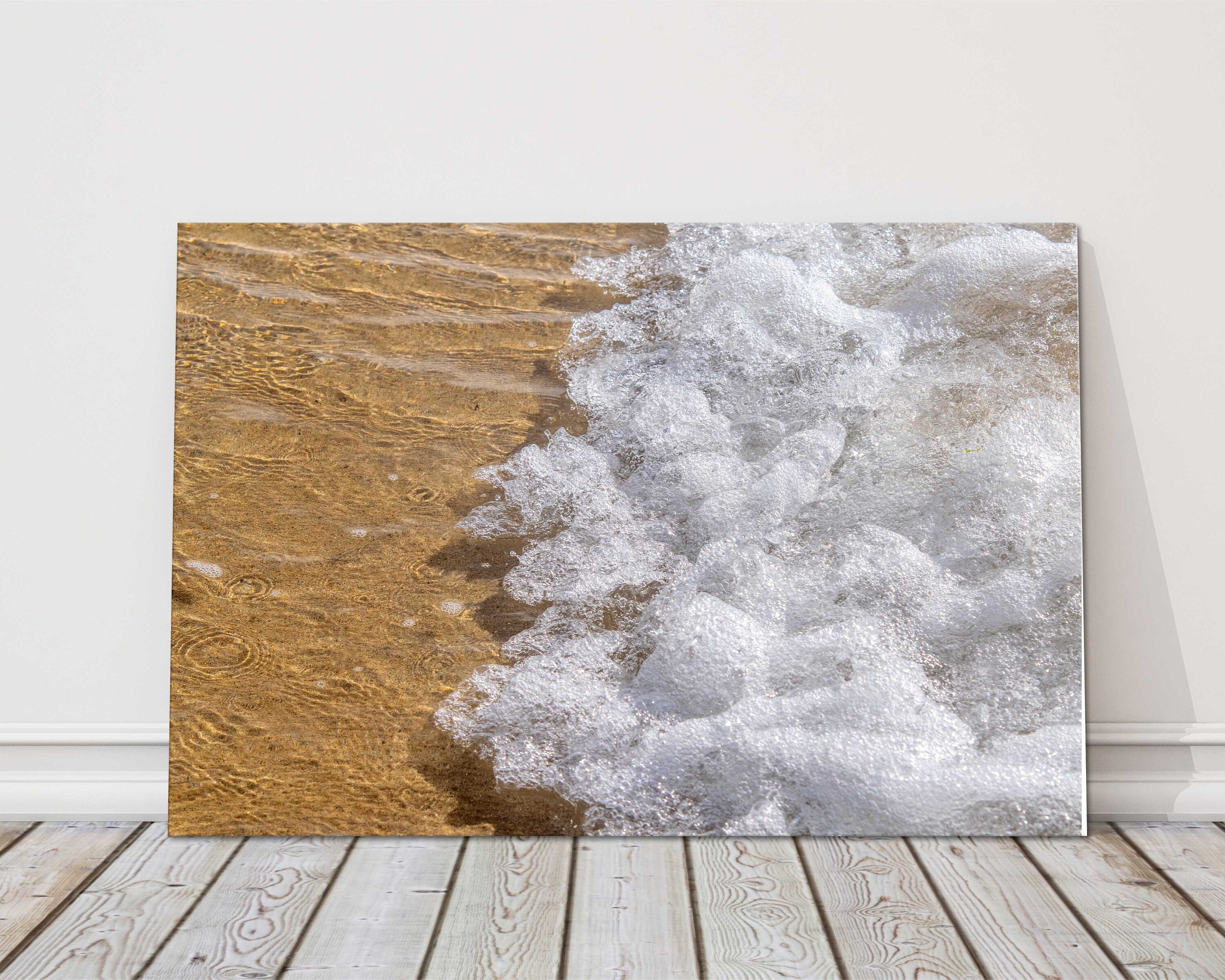 DESCRIPTION Sea foam rolling in on to a sandy beach. Close up beach seascape. Printed and framed as a canvas... Read more