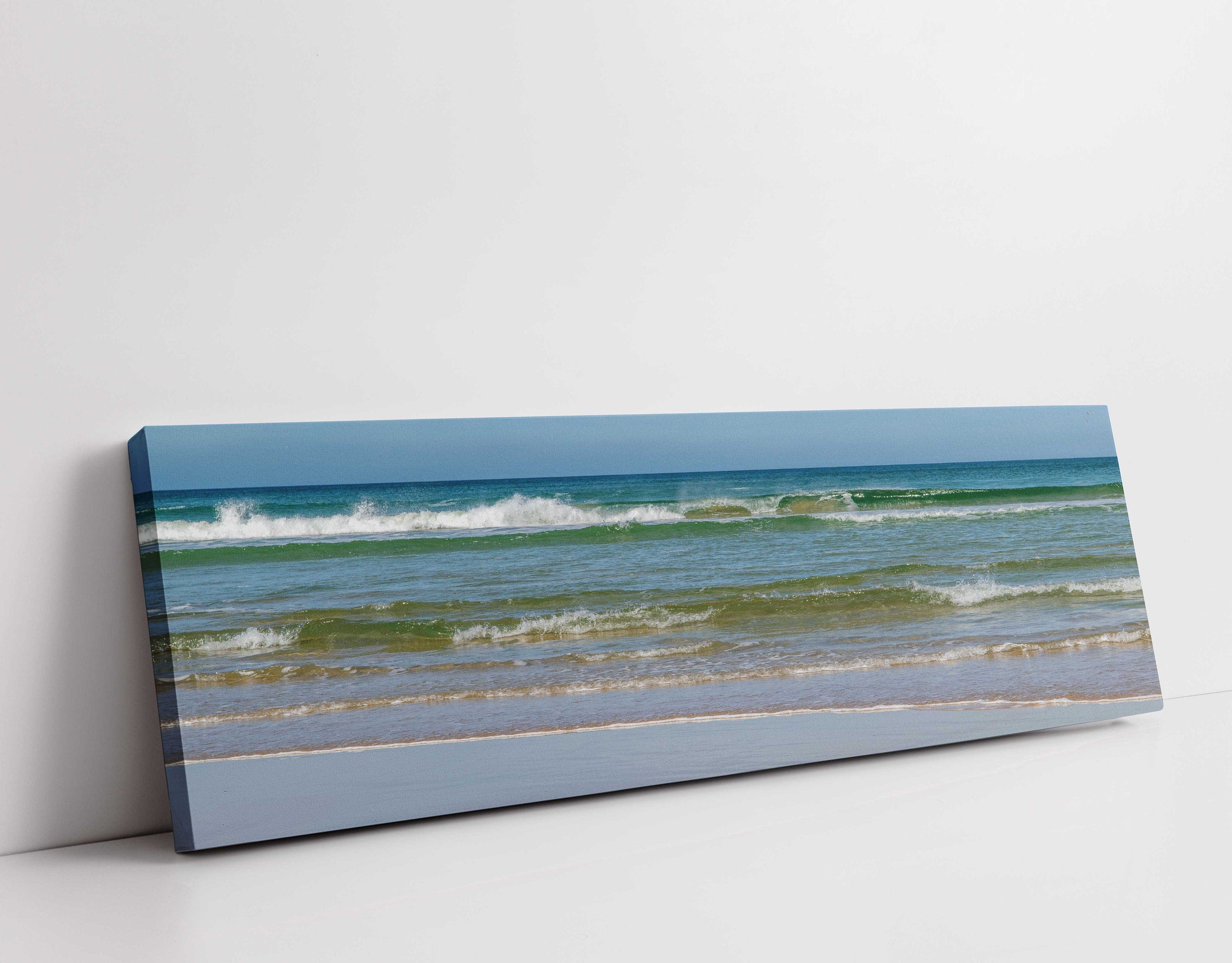 Stunning panoramic of Ocean waves rolling into shore on Cornish coast. Panoramic canvas picture print. ideal gift. Beautiful colours. Available in a choice of sizes to order.