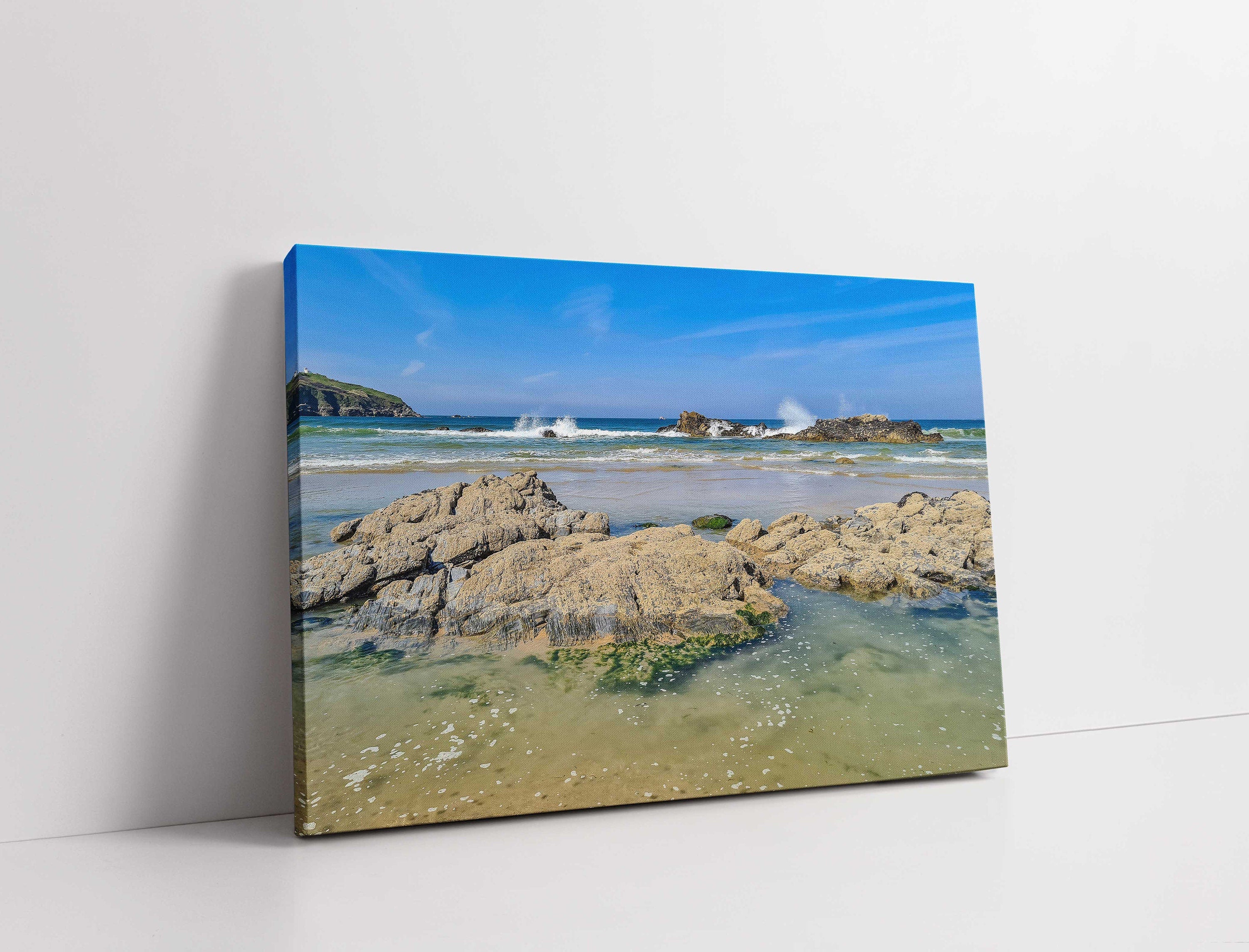 Waves Splashing over the rocks. A beautiful landscape canvas picture of Newquay Bay, North Cornwall. Available to order in a choice of sizes.