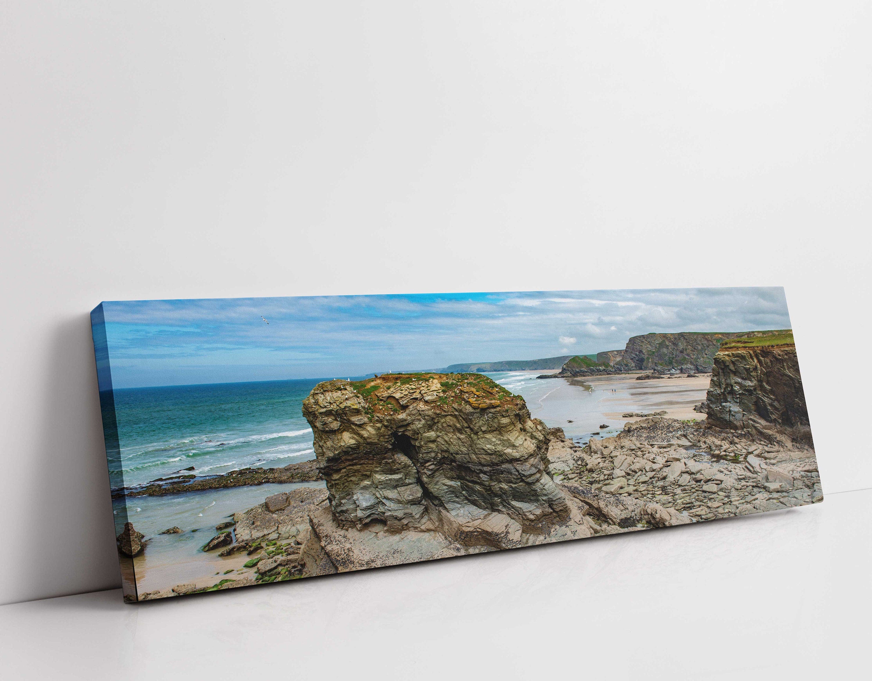 Panoramic picture of Whipsidery Beach and Watergate Bay, Newquay, Cornwall. Beautiful colours of the Cornish coastline. Printed and framed as a canvas print, available in a choice of sizes.