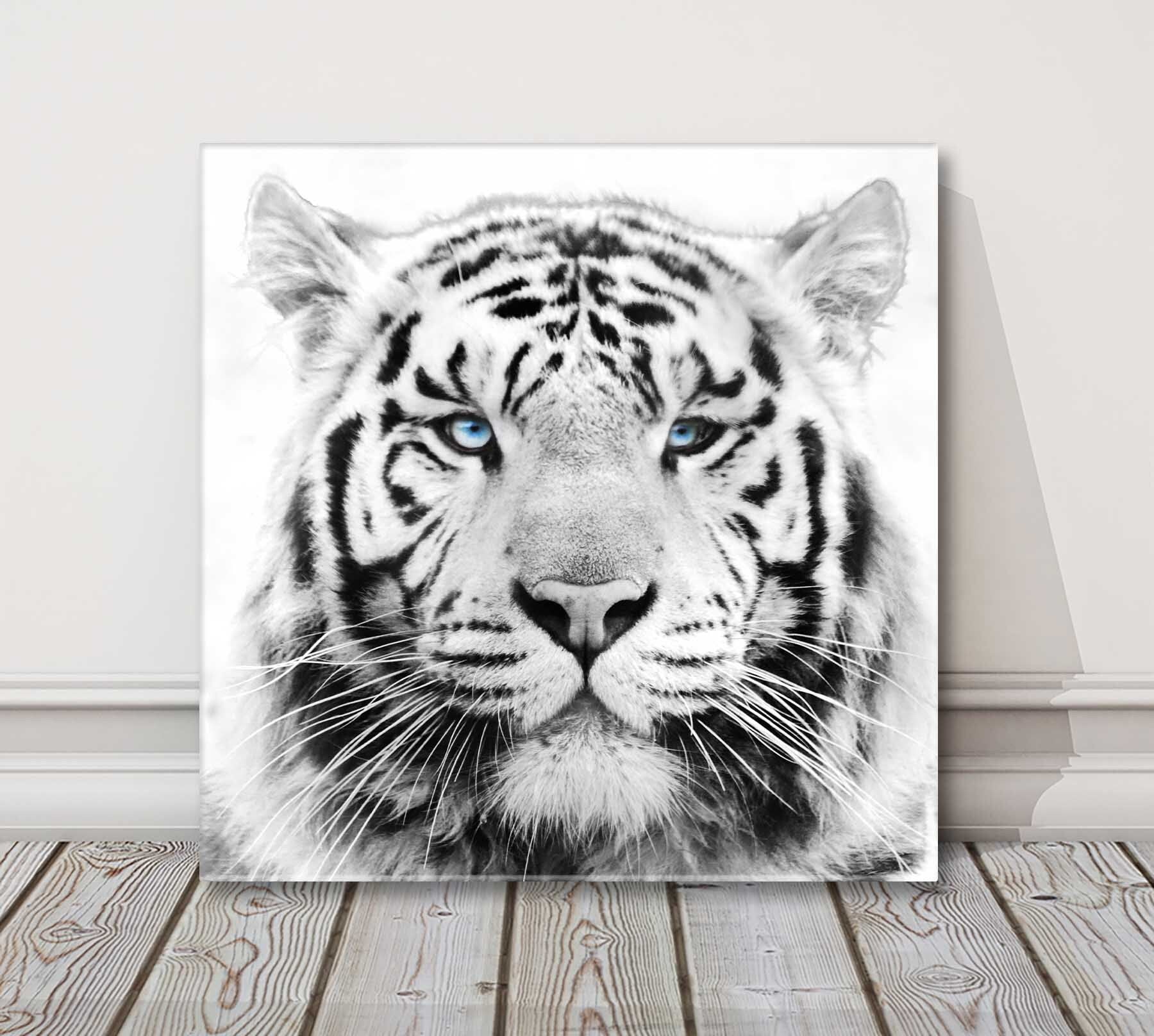 White Siberian Tiger head, with piercing blue eyes. Stunning Canvas picture print. Available in choice of sizes. Beautiful wildlife image.
