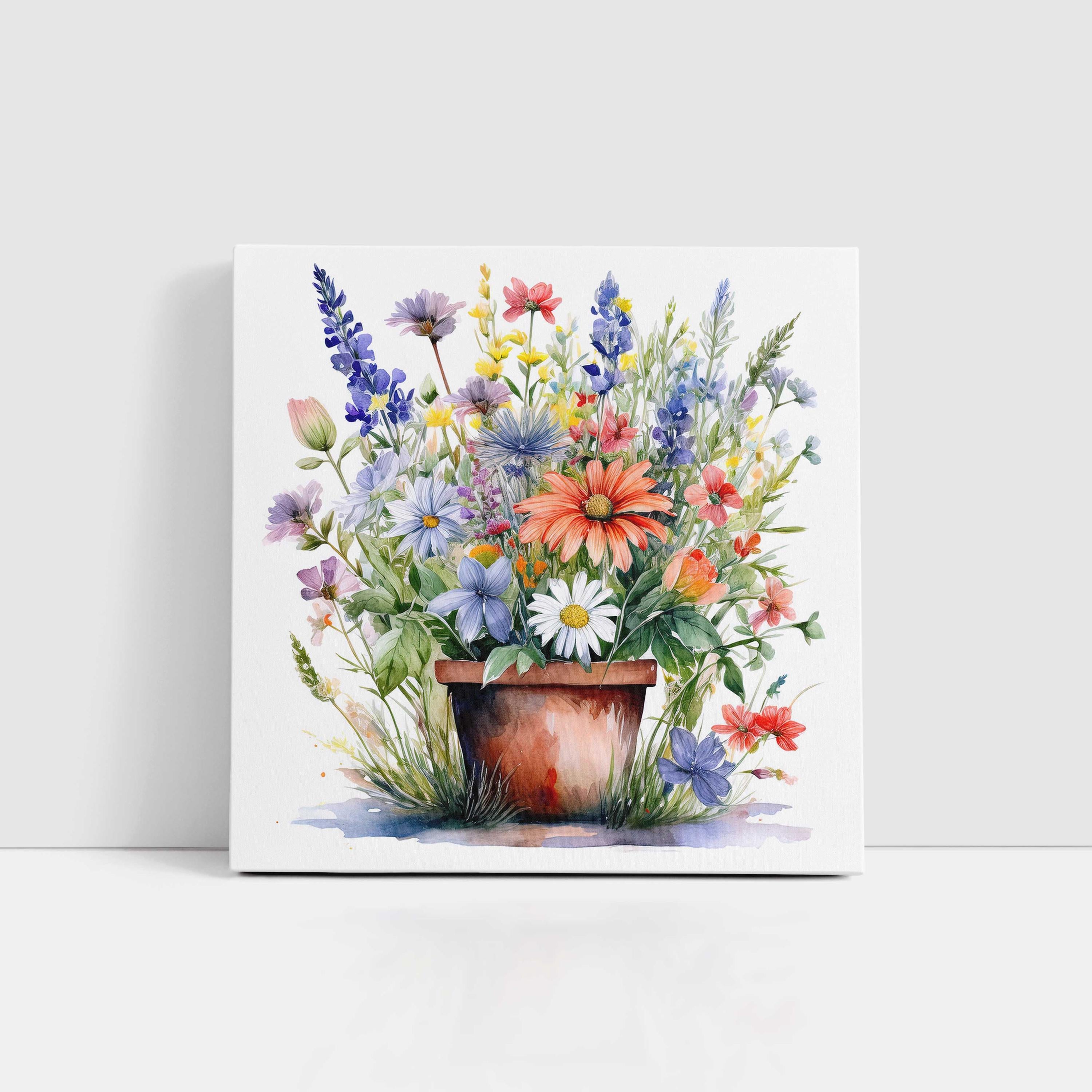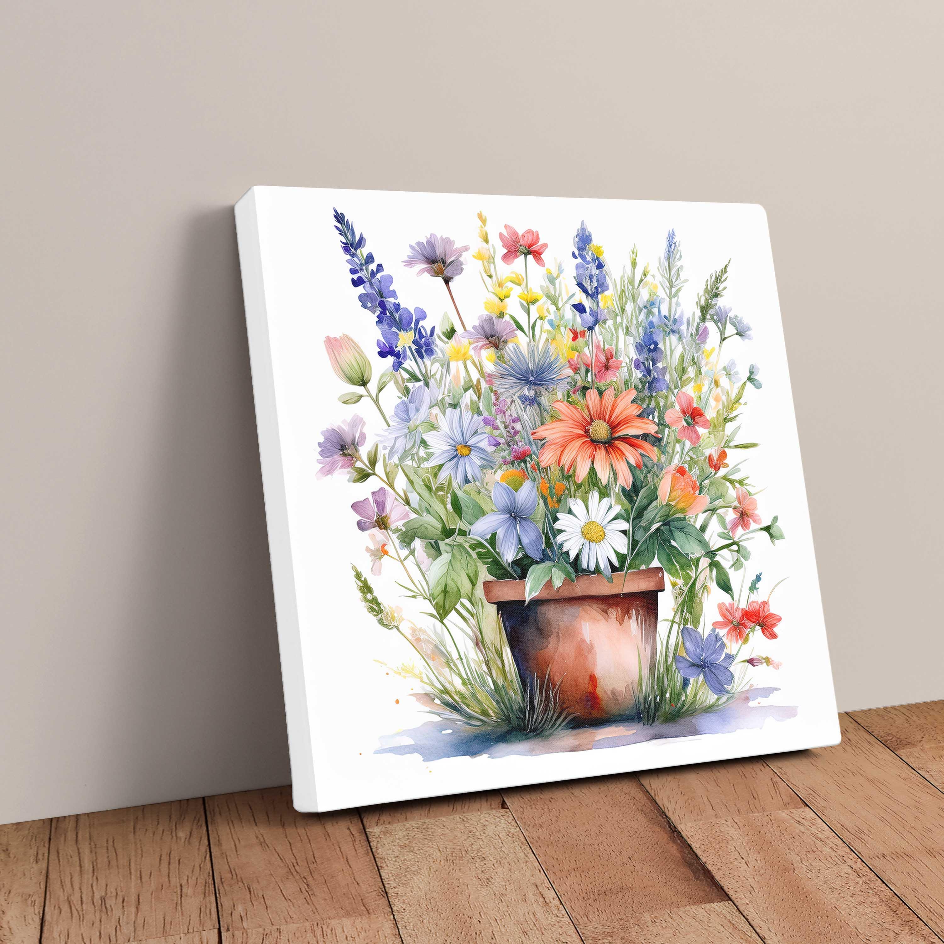 Watercolour canvas picture of potted wild flowers in bloom. Printed and framed as a canvas picture print. Beautiful in any home. Wall art. A choice of sizes available to order.