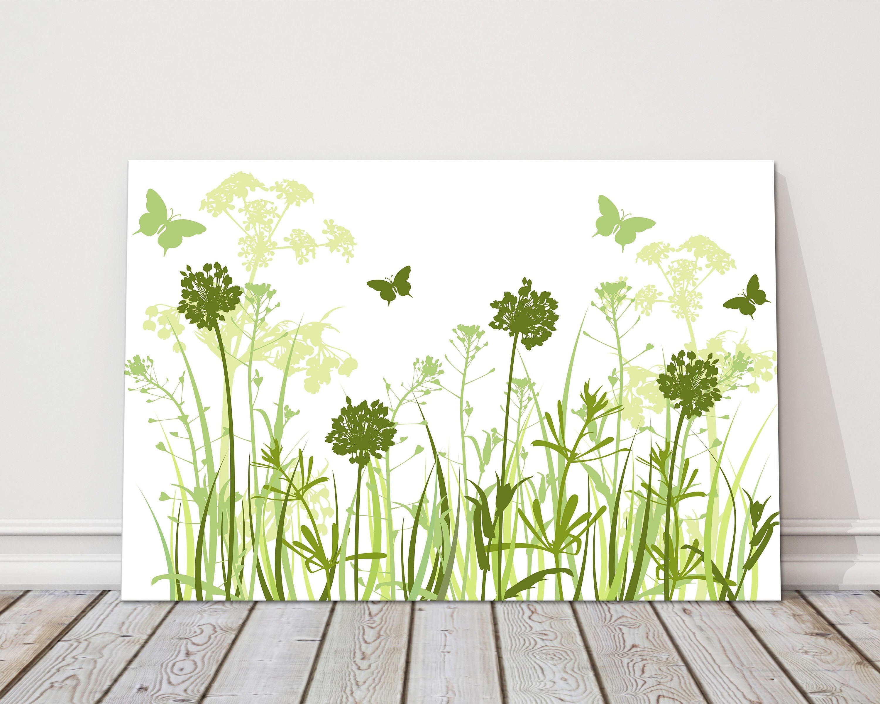 Wild flowers, green grasses. Canvas picture print green and white art