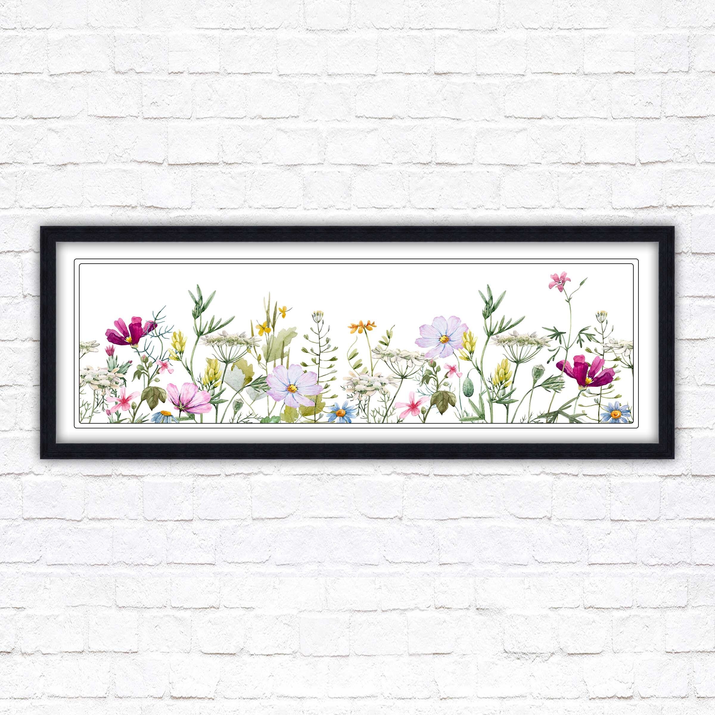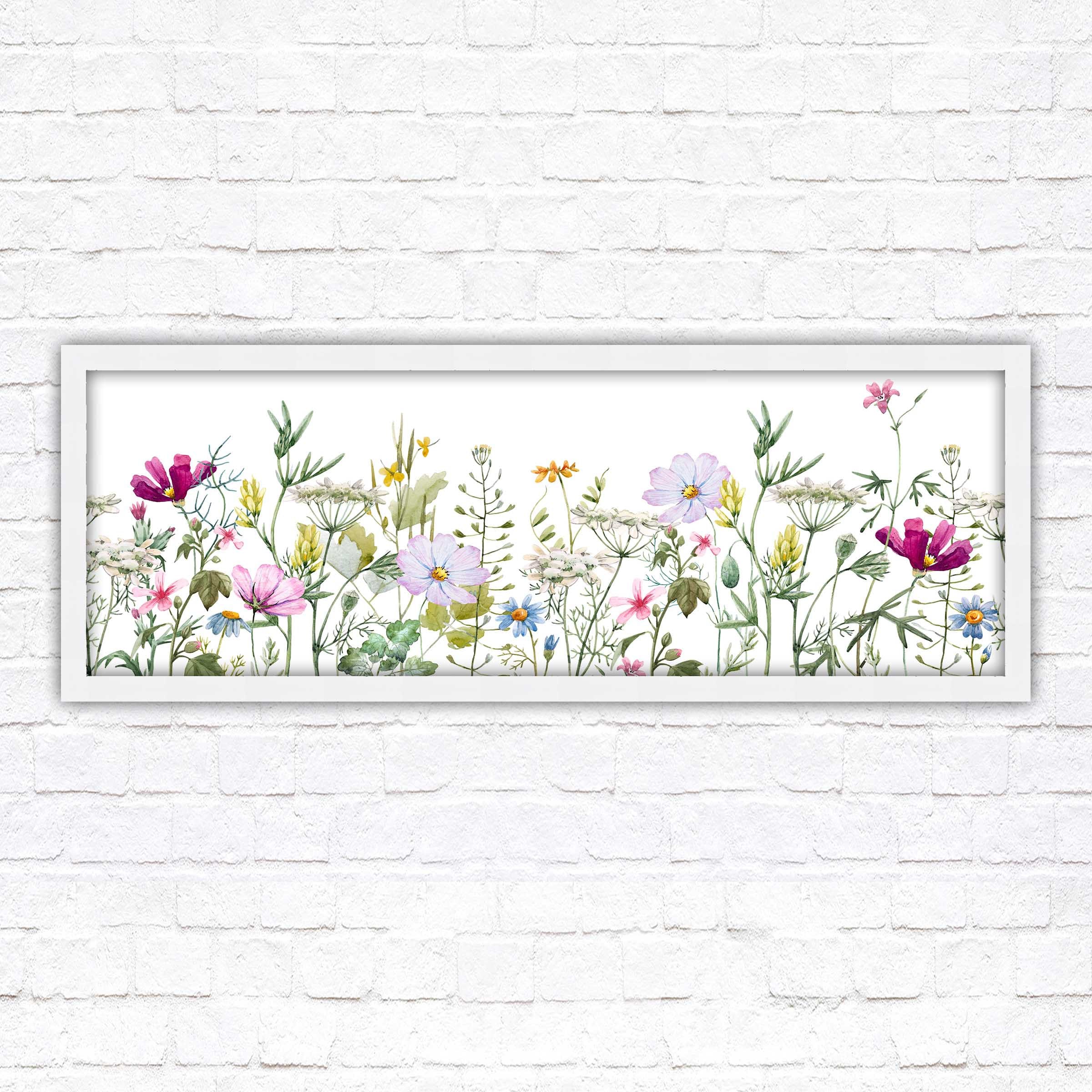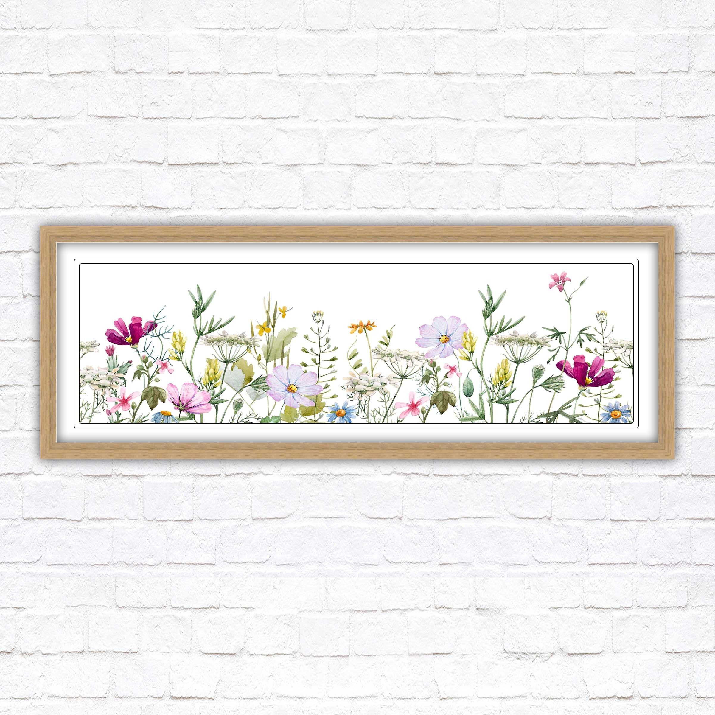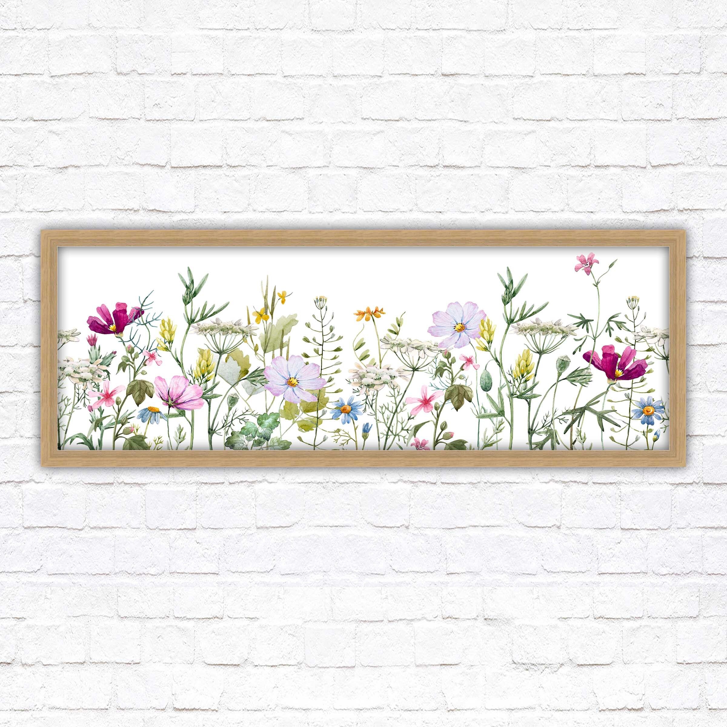 Wild flowers in pastel colours on a white background. A beautiful panoramic framed picture print. Choice of size, frame colours and borders.