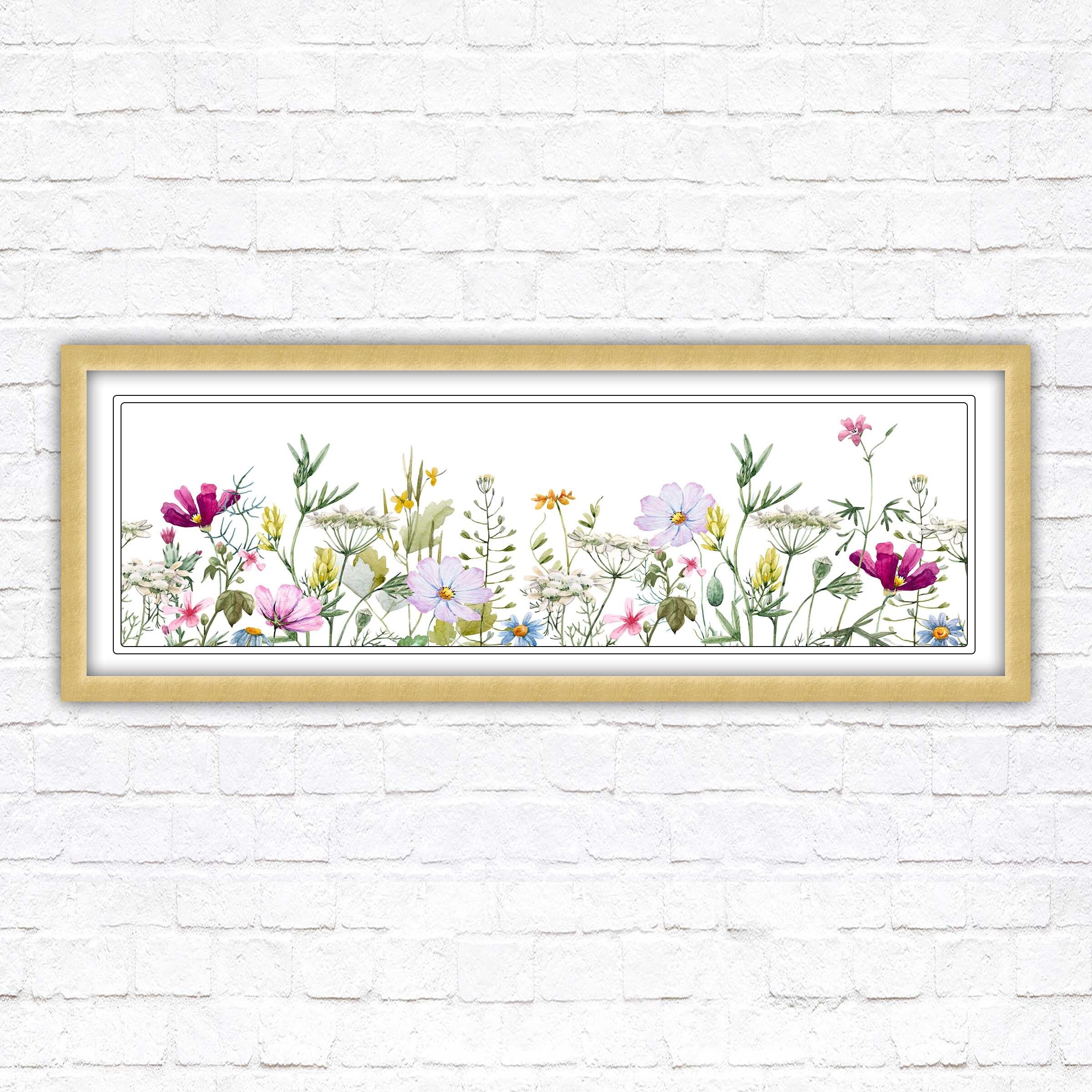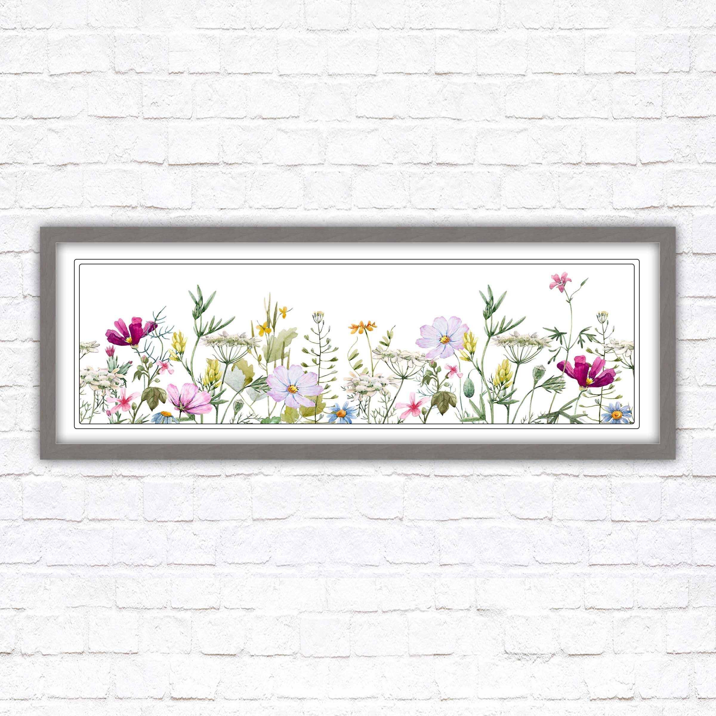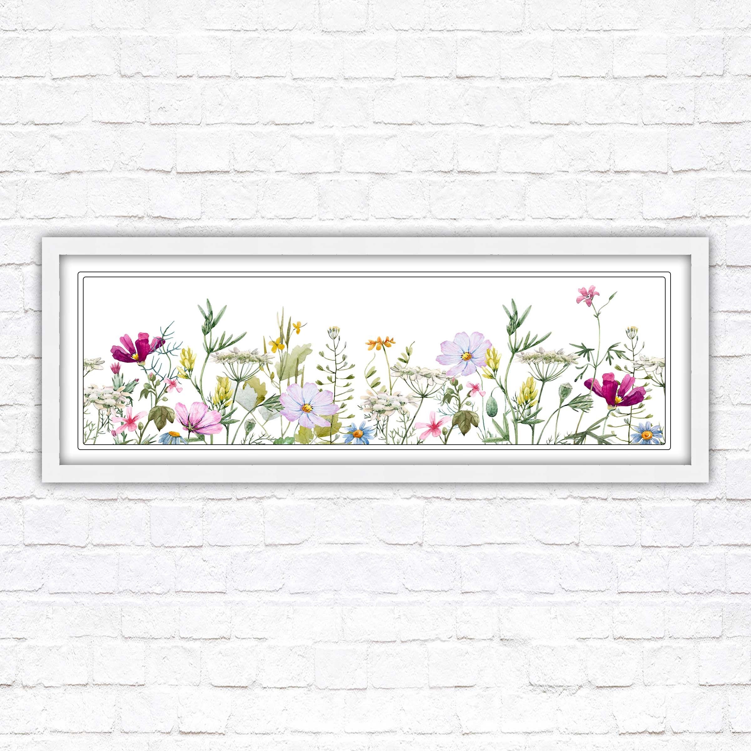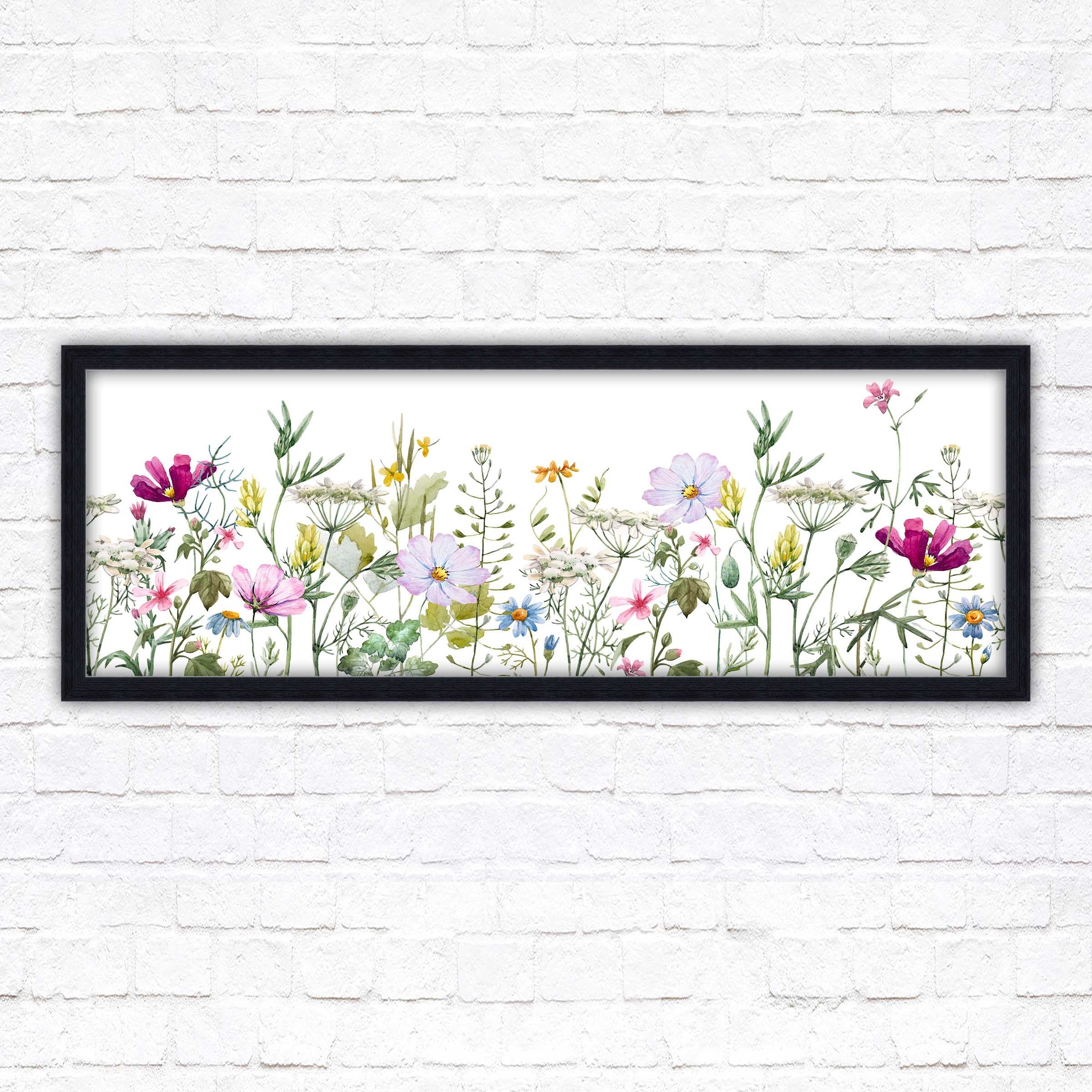 Wild flowers in pastel colours on a white background. A beautiful panoramic framed picture print. Choice of size, frame colours and borders.