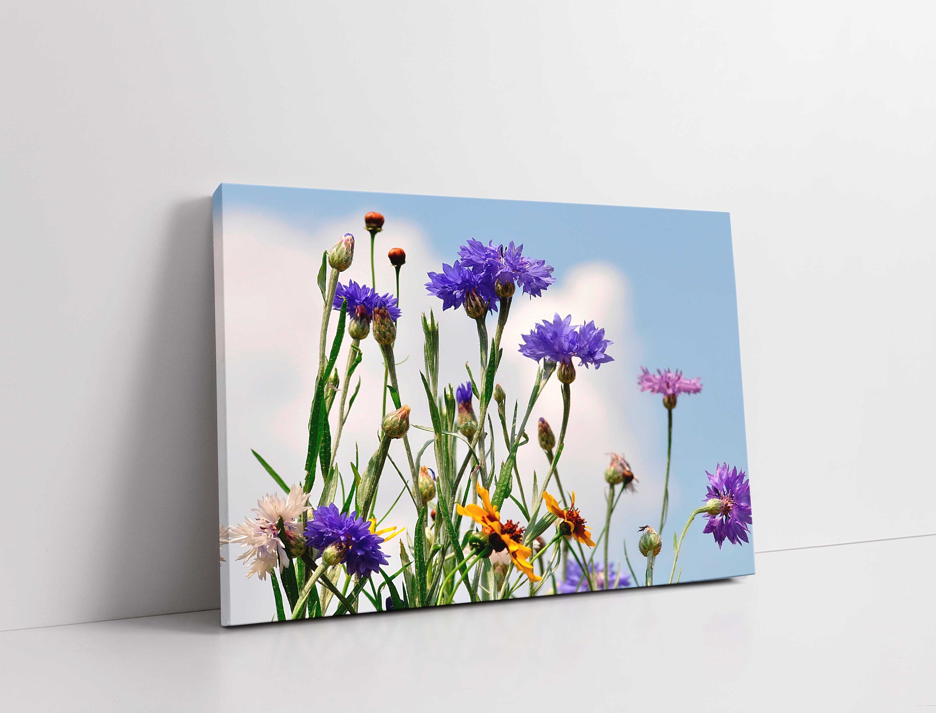 DESCRIPTION Wild flowers. Floral image cornflowers a blue sky background. Printed and framed canvas picture print. Beautiful in any home.... Read more