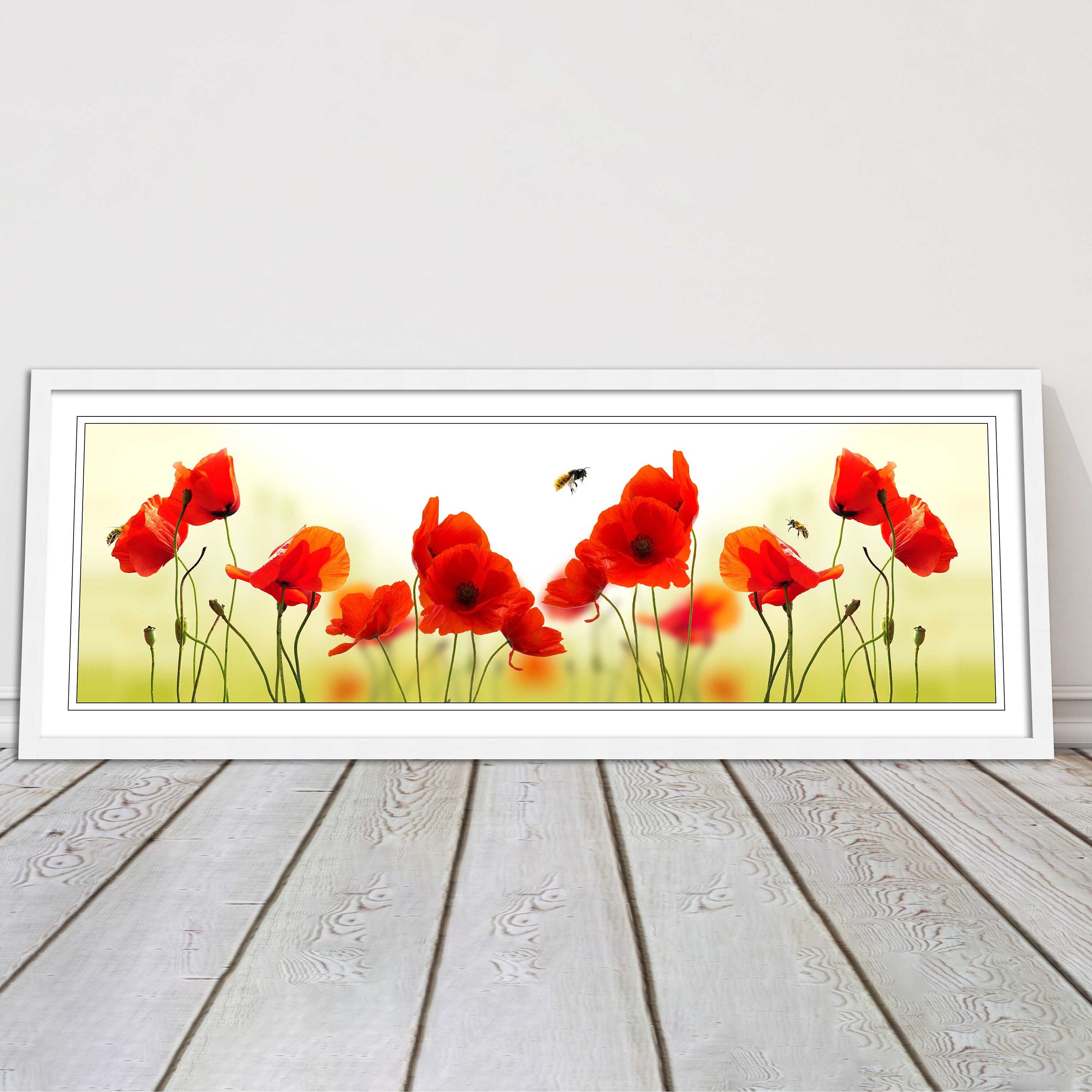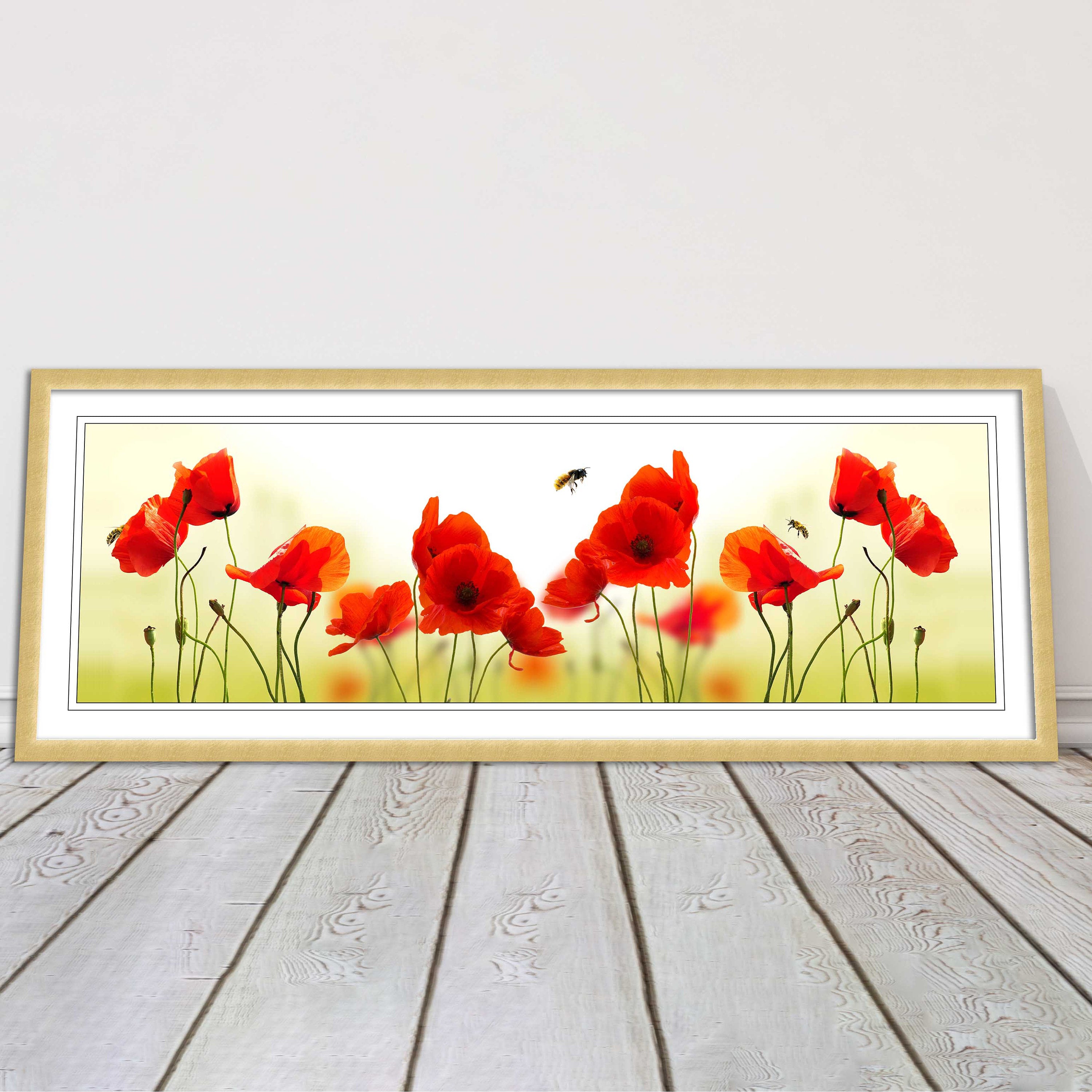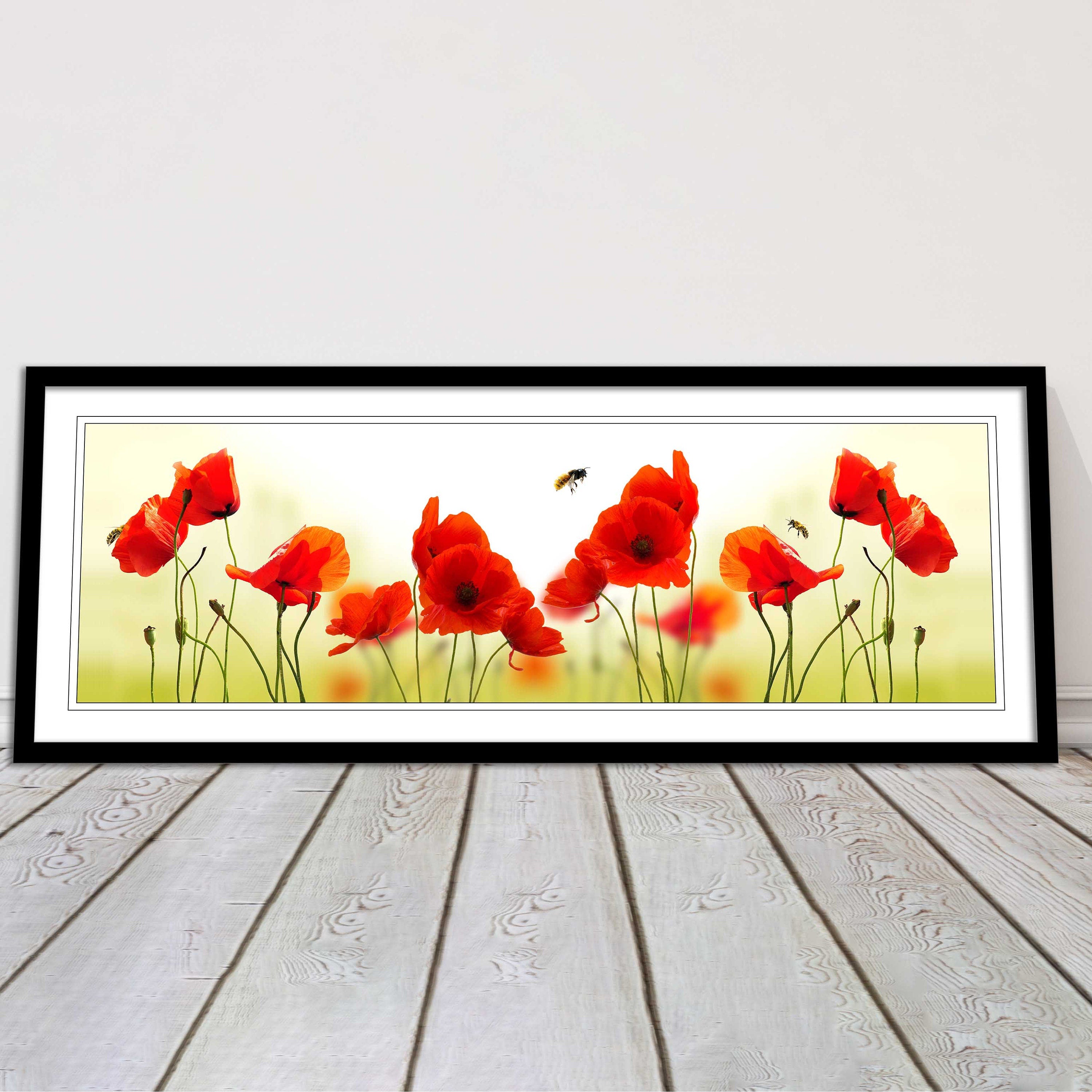 Wild Poppies and Bees. A beautiful bright, panoramic framed picture print. Choice of size, frame colours and borders.