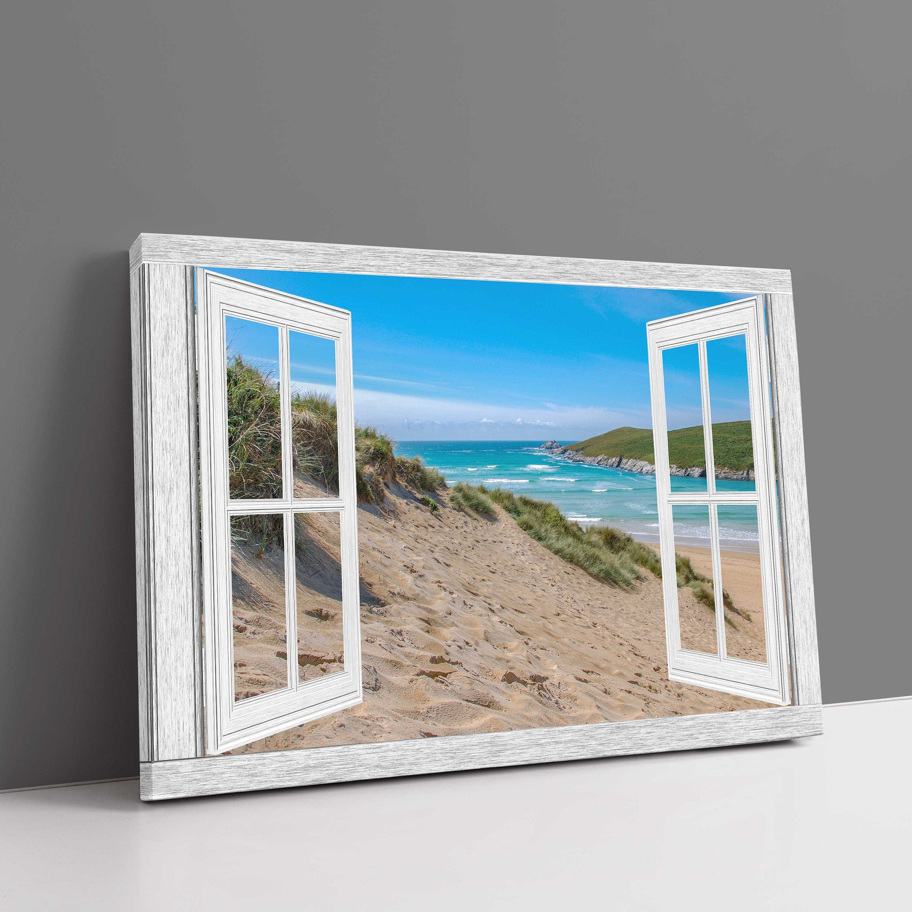 DESCRIPTION Window frame canvas print. Crantock beach, Newquay. Printed and framed as a canvas print. Beach. Sea. Wall art for... Read more