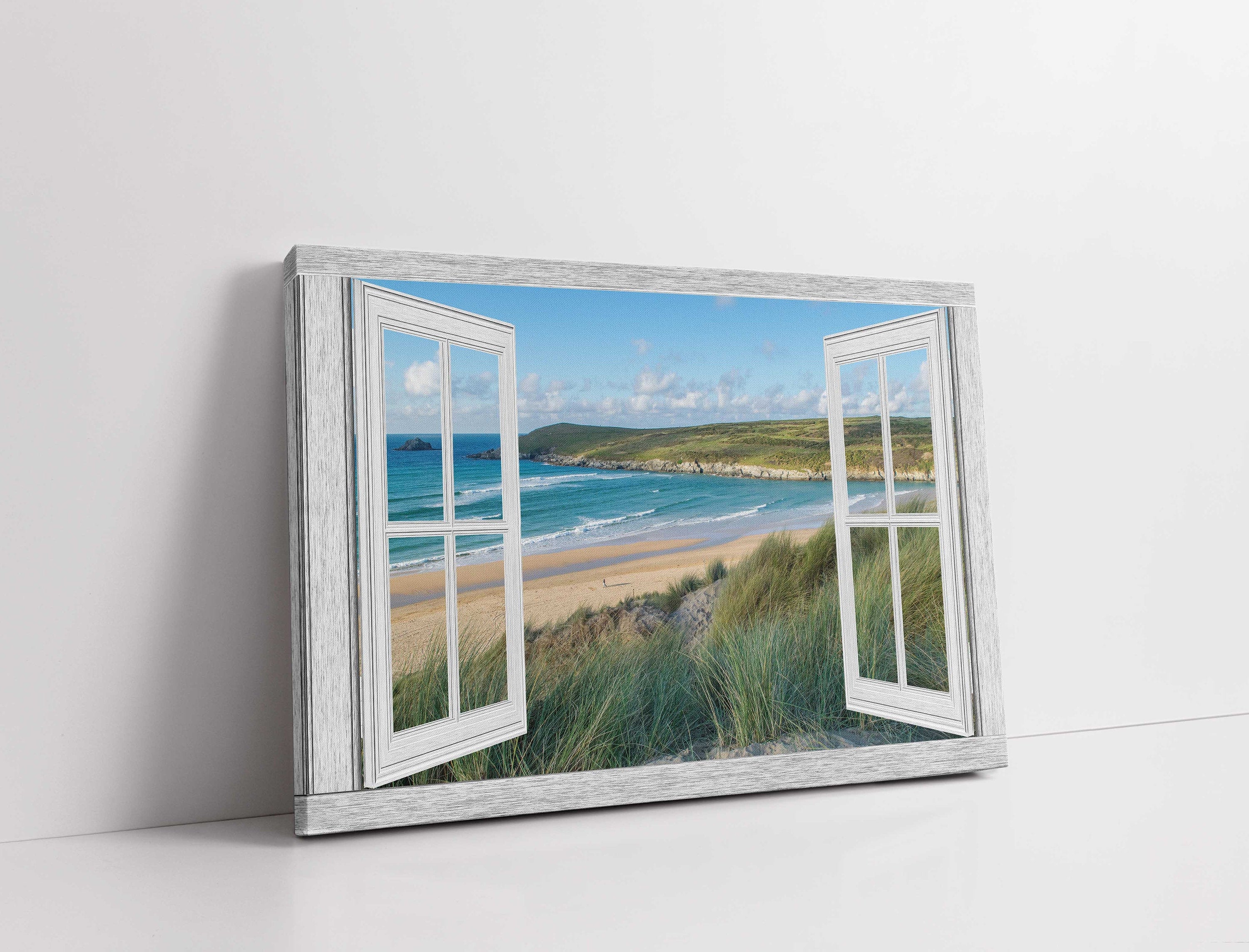 Window frame canvas print. Crantock beach, Newquay. Printed and framed as a canvas print. Beach. Sea. Made using UK sourced... Read more