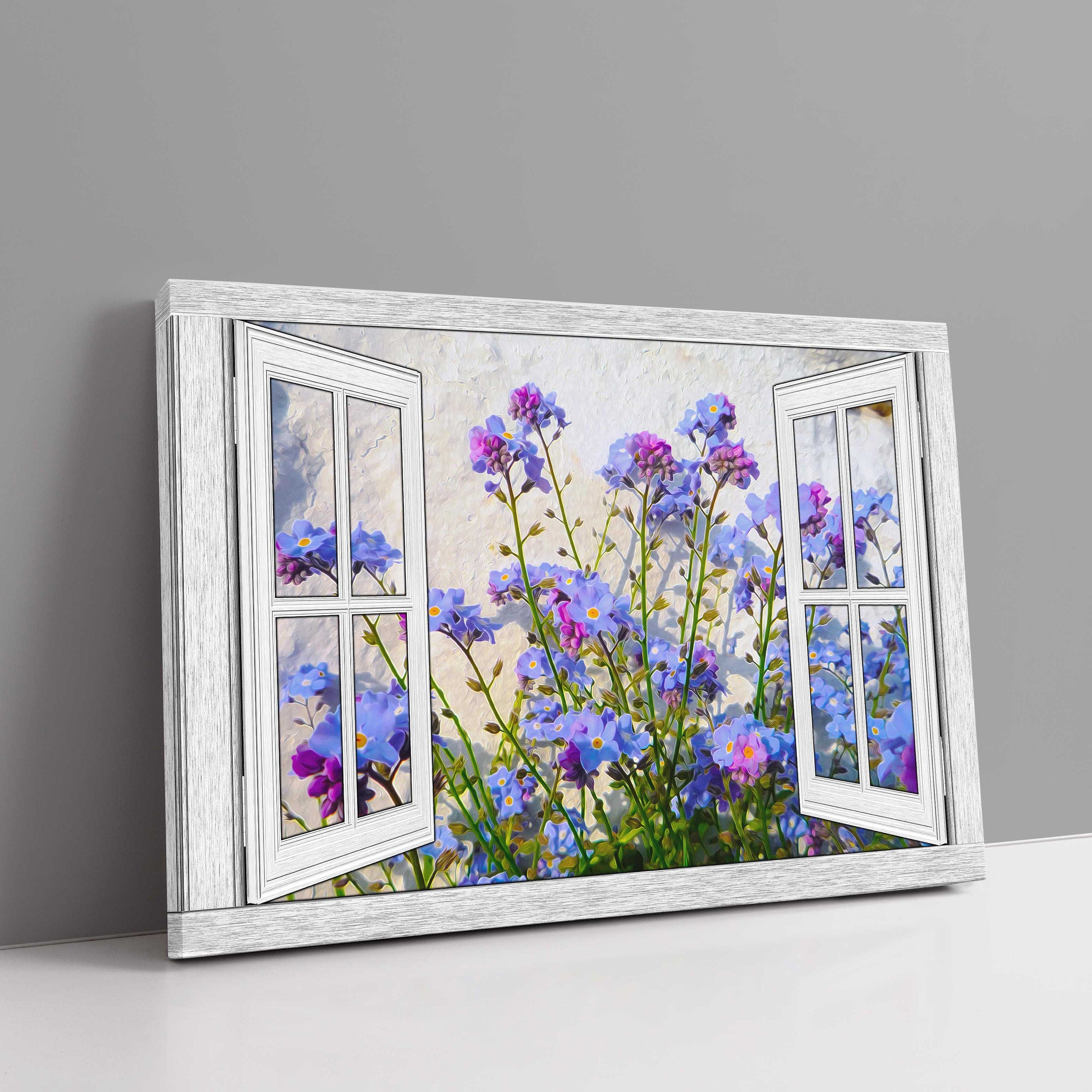 DESCRIPTION Window frame canvas print. Forget me nots, Pictured in front of a white stone wall. Printed and framed as... Read more