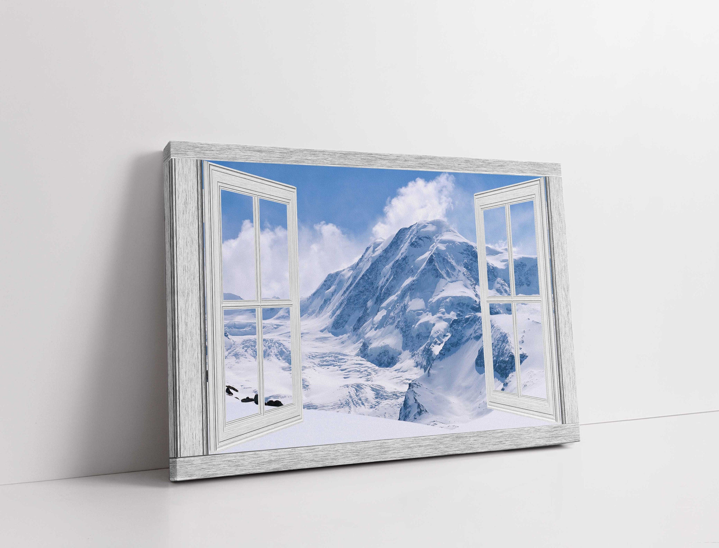 Window frame style, printed and framed as a canvas print. Snow covered mountains. Winter scene. Available in a choice of... Read more
