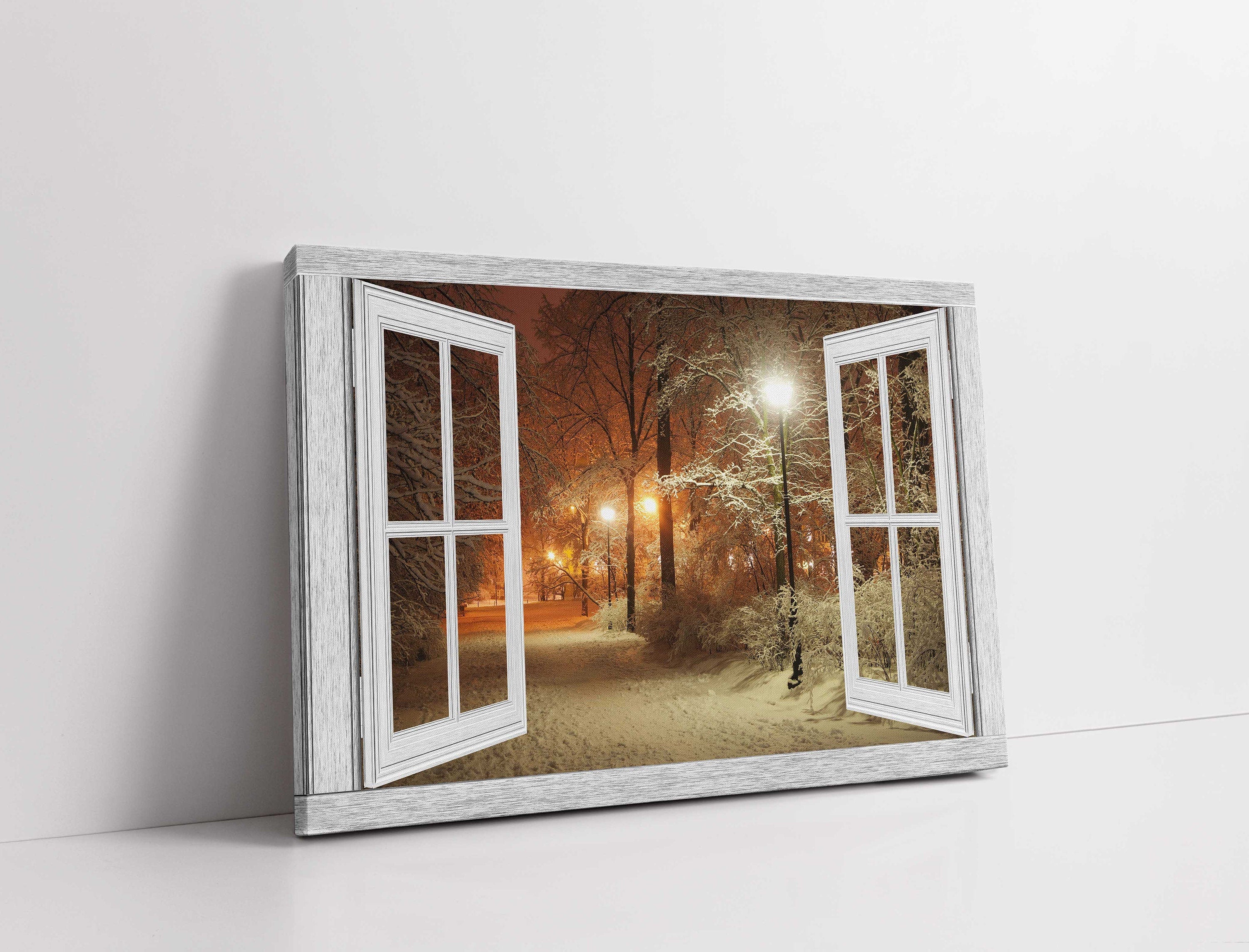 Window frame style, printed and framed as a canvas print. Winter scene at night. Tree lined path. Available in a... Read more