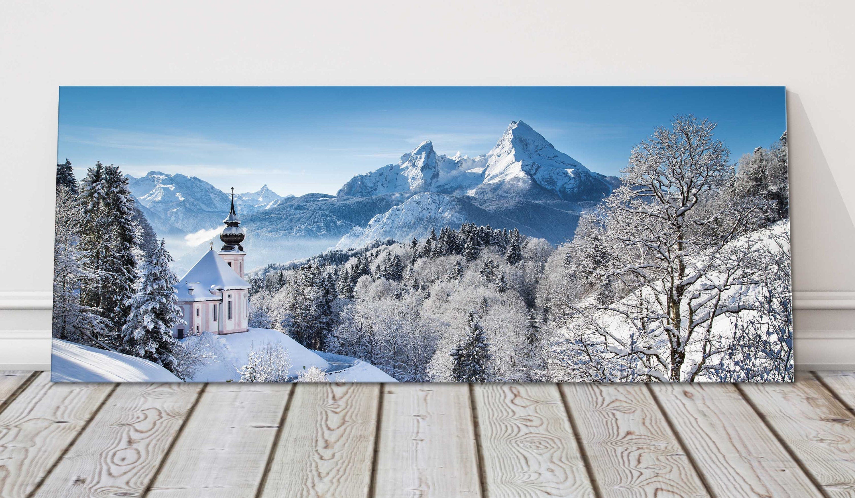 A beautiful panoramic picture of the Bavarian Alps covered in snow. Church pictured in the snowy landscape. Choice of sizes available to order.