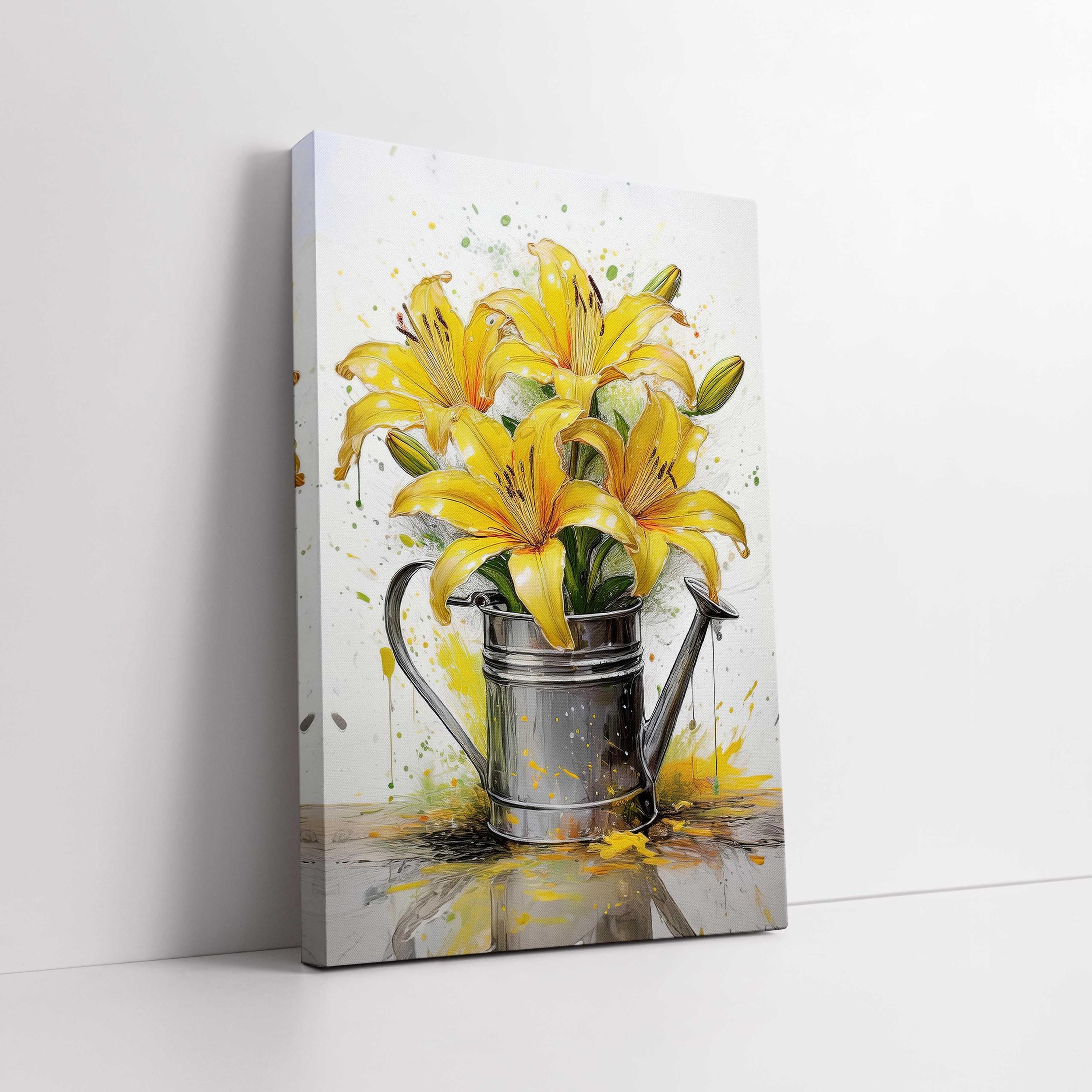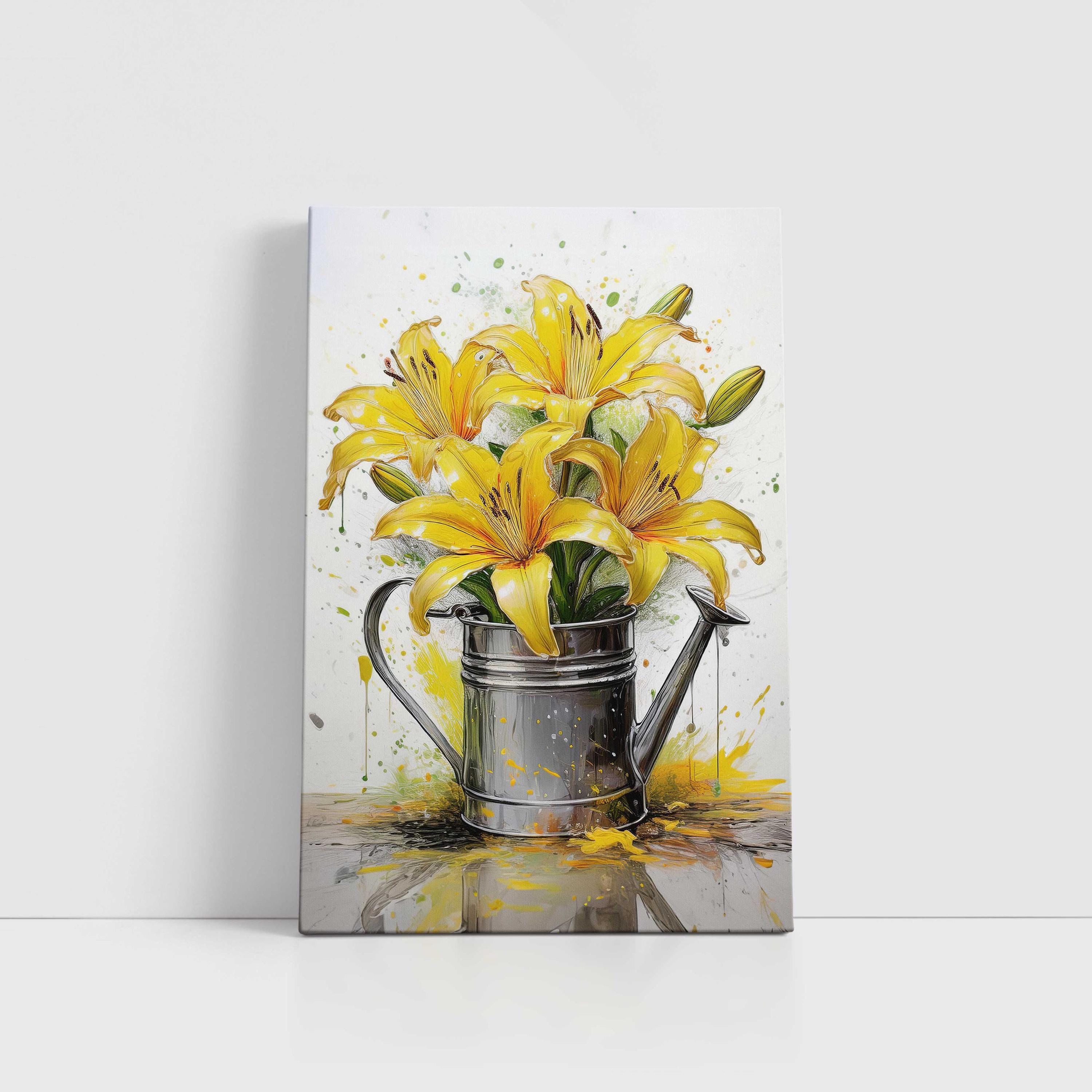Yellow lilies. Displayed in metal watering can. Painting effect. Printed and framed as a canvas picture print. A range of sizes available. Colourful wall art for the home. Mothers day.